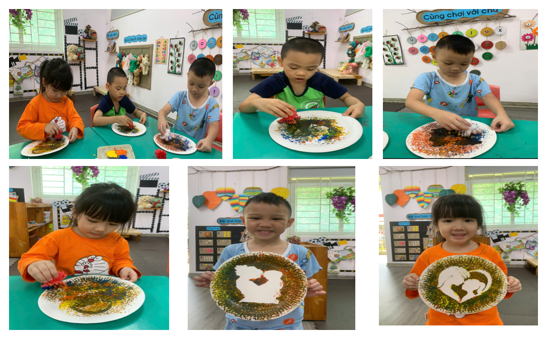 • Vận động tinh: Bé rèn luyện sự khéo léo của đôi tay khi cầm cọ, in hình và tô màu.