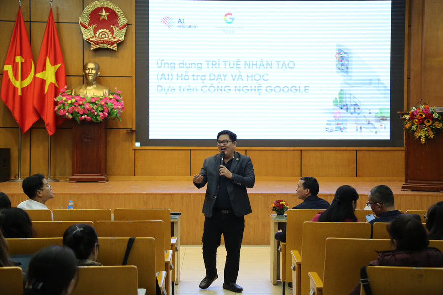 Hiệu trưởng Google Gemini AI Academy Trần Bung giới thiệu công nghệ Google hỗ trợ chuyển đổi số trong giáo dục và xây dựng năng lực số theo khung năng lực số của Việt Nam.