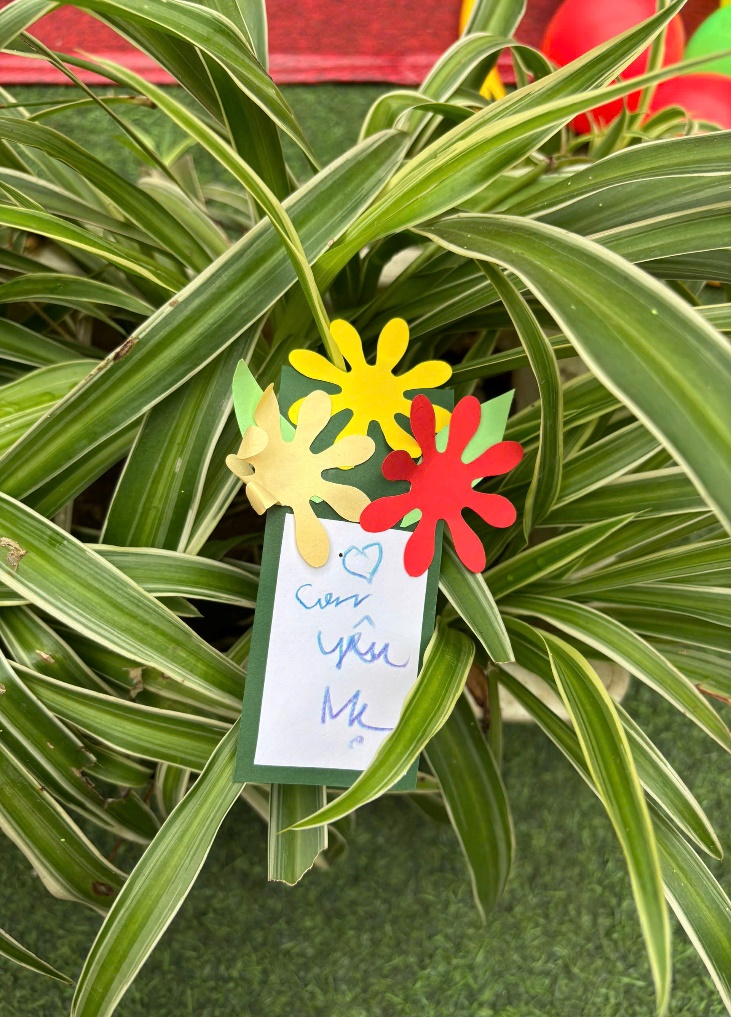Trước khi đến với chương trình, ngay tại lớp học, các bé đã tự tay làm những tấm thiệp nhỏ xinh dành tặng mẹ. Điều đặc biệt là trong mỗi tấm thiệp, các cô giáo đã ghi lại những lời nói mộc mạc, hồn nhiên của chính các con gửi tới mẹ – có bé nói “Con yêu mẹ nhiều lắm”, có bé chỉ giản dị “Mẹ ơi, con thương mẹ”, nhưng tất cả đều chứa đựng tình yêu trong trẻo và chân thành của tuổi thơ. Những tấm thiệp nhỏ bé ấy đã trở thành món quà ý nghĩa, mang theo thông điệp yêu thương mà các con muốn gửi đến mẹ trong ngày đặc biệt.
