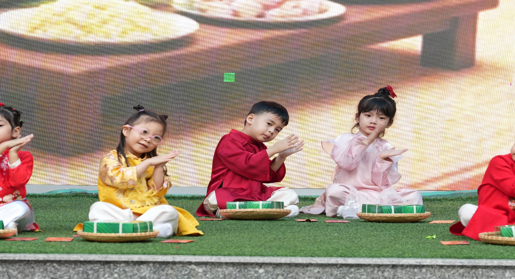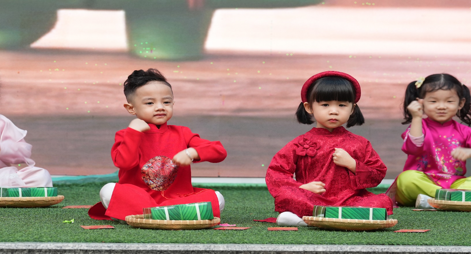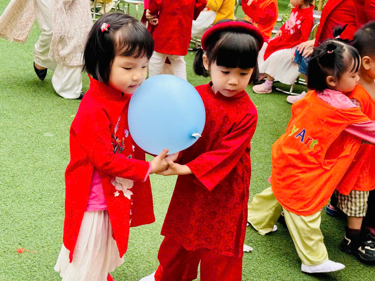 Trong chương trình, các bé lớp C1 đã tự tin tham gia tiết mục mashup “Bánh Chưng Bánh Tét – Lì Xì Đỏ” với những bước nhảy hồn nhiên và đáng yêu. Sau những buổi tập luyện cùng các cô giáo, các con đã mạnh dạn bước lên sân khấu, mang đến bầu không khí rộn ràng và đầy sắc xuân.