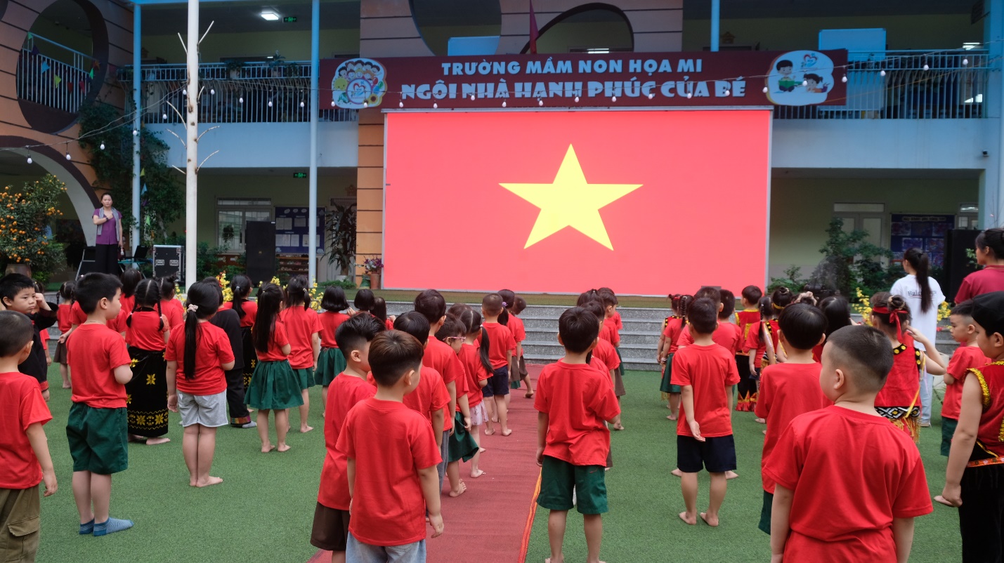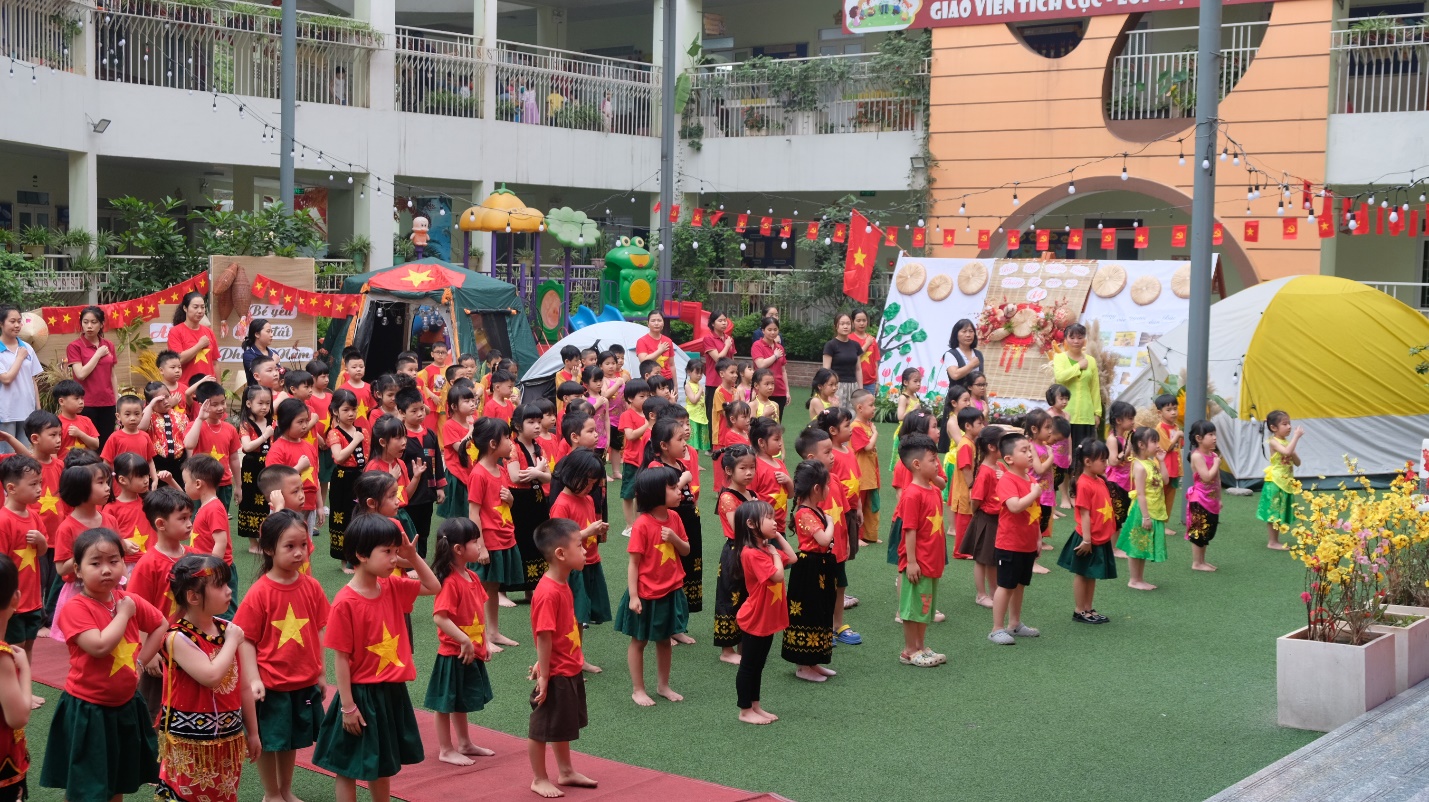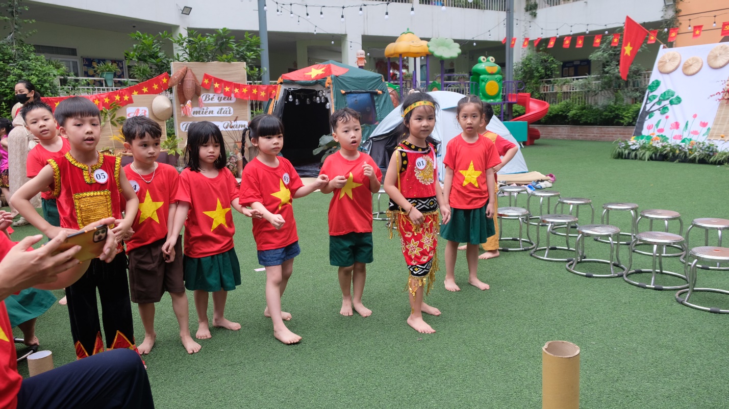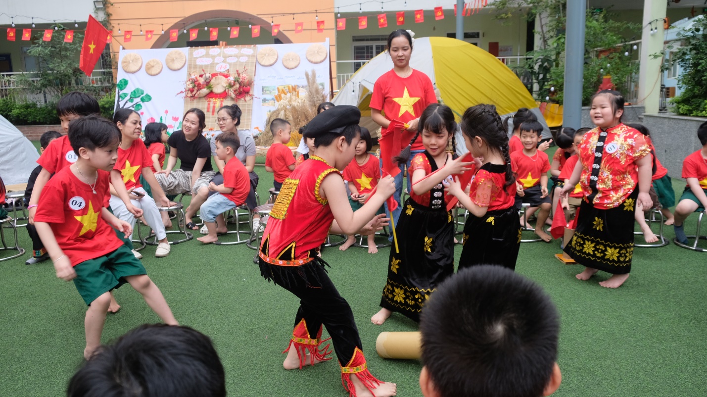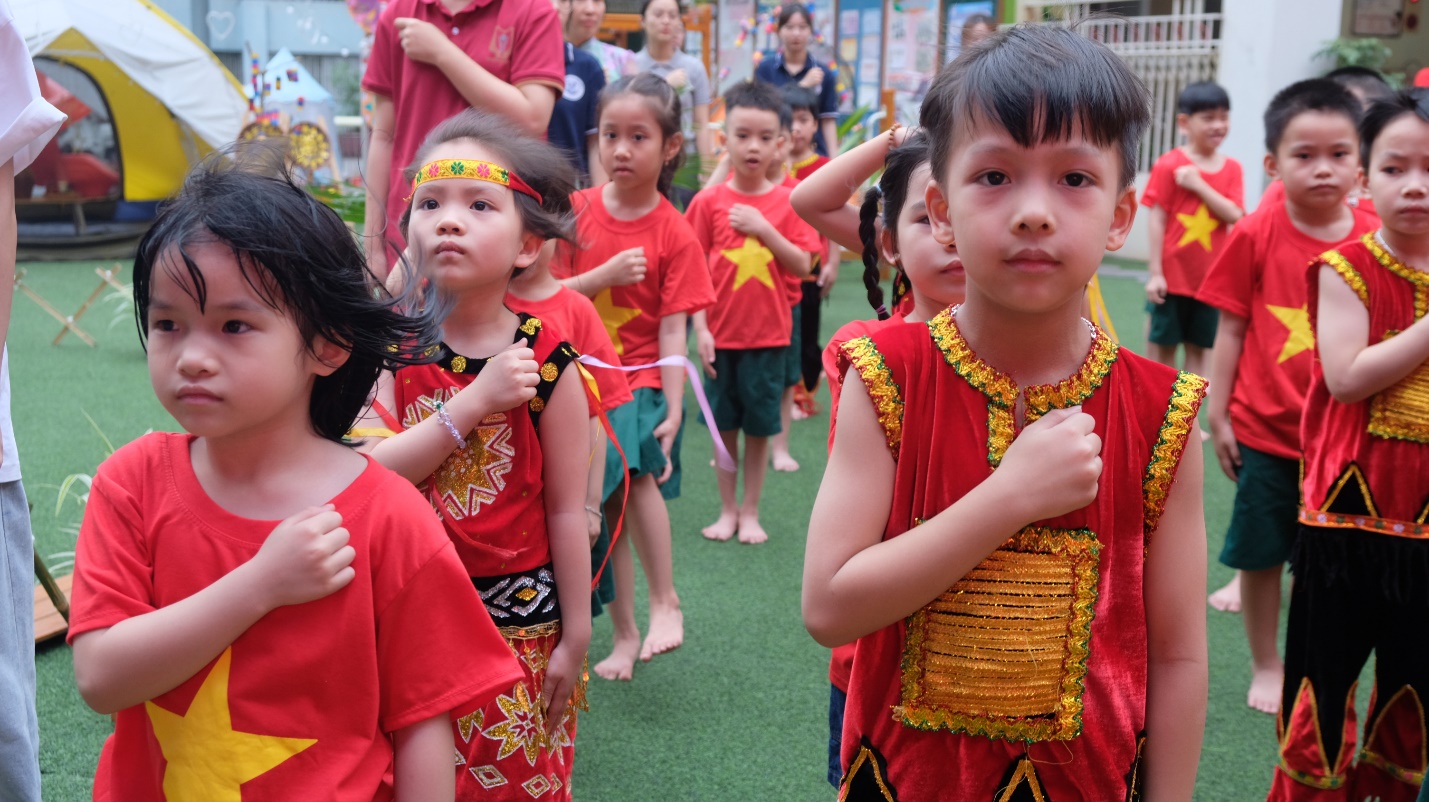 Mở đầu lễ hội, các bé A1 đã hòa mình trong điệu nhảy dân vũ sôi động “Việt Nam ơi” cùng các bạn khối Mẫu giáo lớn khác – như một lời chào đầy tự hào và gắn kết từ mọi miền tổ quốc.