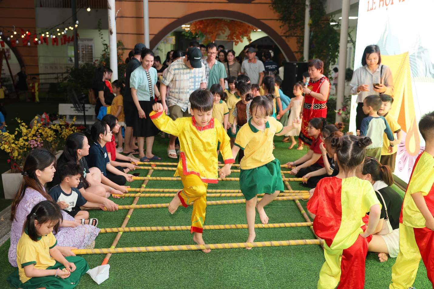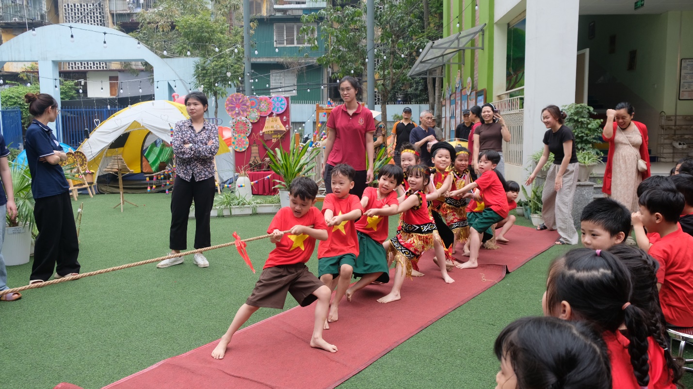Sau đó, các bé hào hứng tham gia các trò chơi dân gian truyền thống: chuyền trứng, cướp cờ, kéo co… Những tiếng cười giòn tan vang lên giữa nắng vàng rực rỡ, gắn kết tình bạn, khơi dậy niềm vui vận động, tinh thần đoàn kết và sự nhanh nhẹn, khéo léo ở mỗi bạn nhỏ.