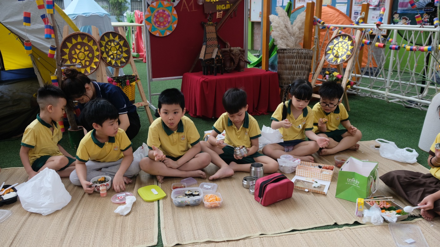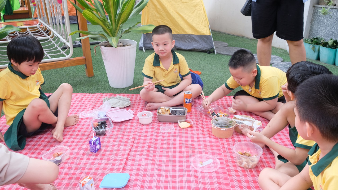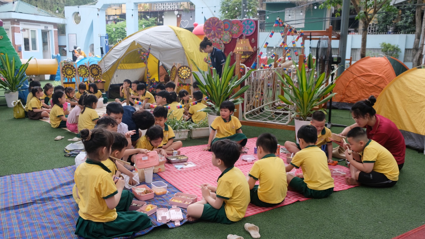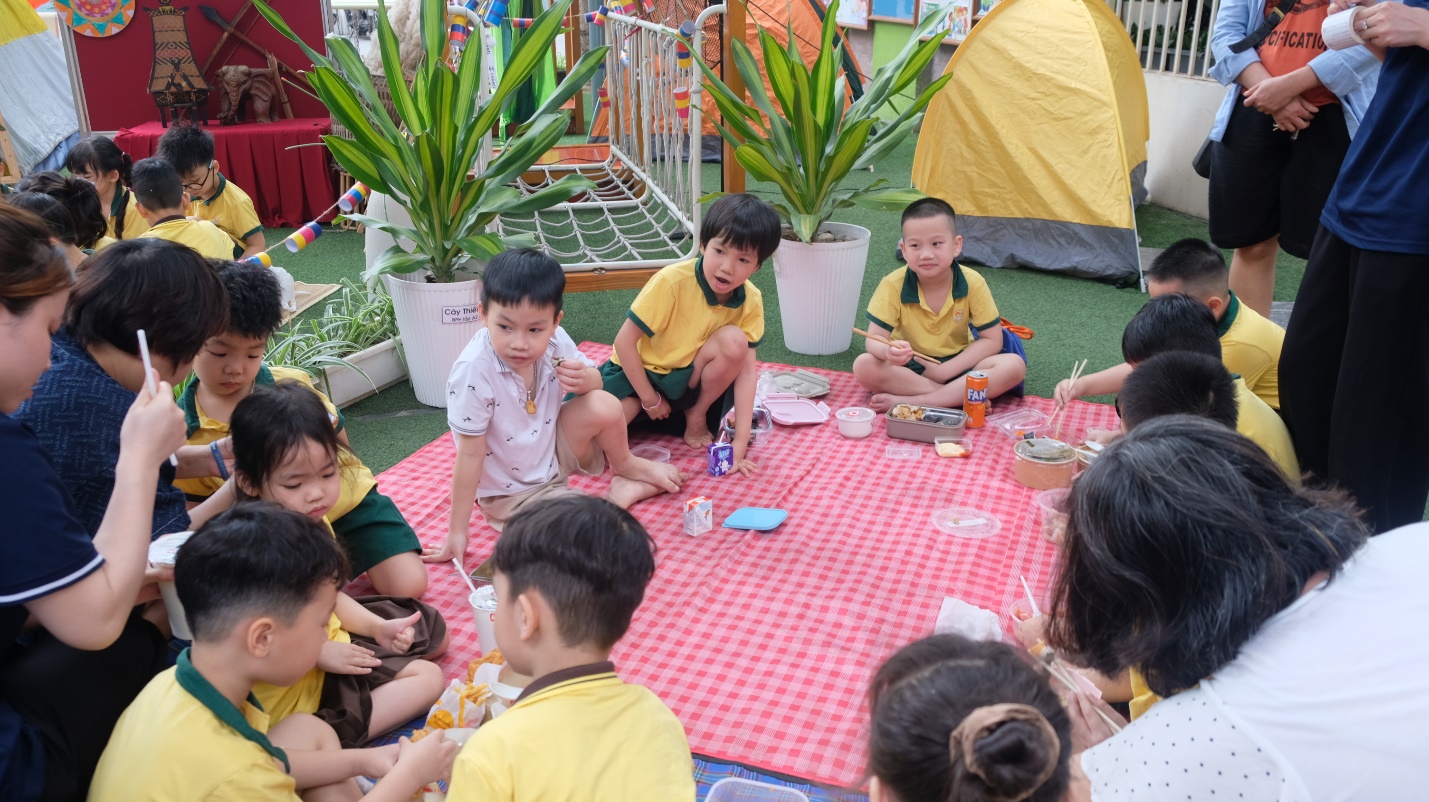 Giờ ăn trưa cũng thật đặc biệt – một bữa cơm dã ngoại ấm cúng do chính bố mẹ chuẩn bị, được các con thưởng thức ngay tại lều trại mang đậm chất Tây Nguyên của lớp mình. Những chiếc hộp cơm xinh xắn, những món ăn đầy yêu thương là sự tiếp nối trọn vẹn của một ngày hội ý nghĩa.