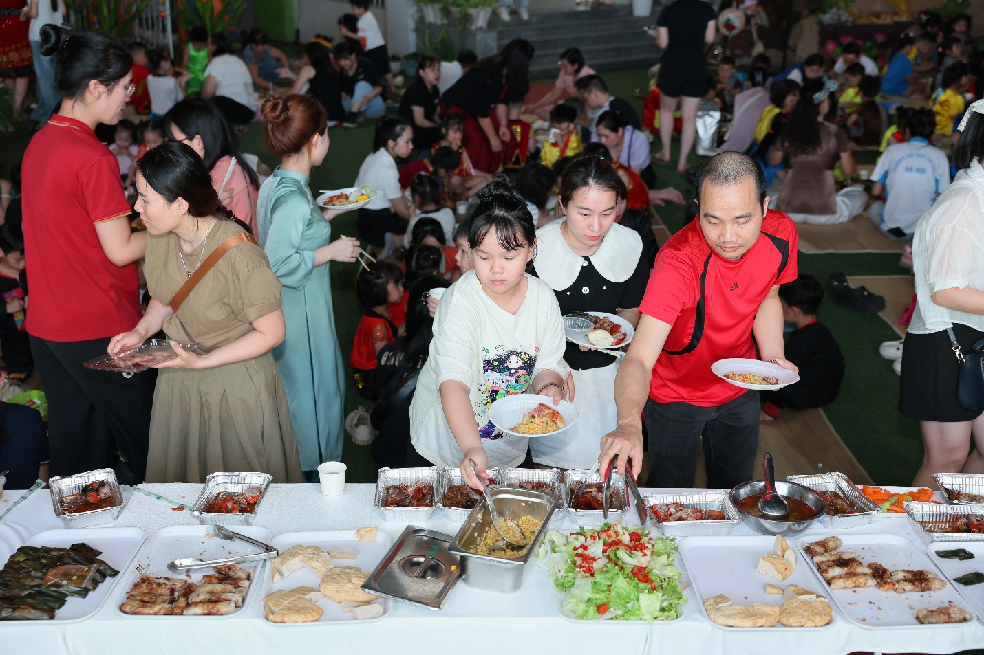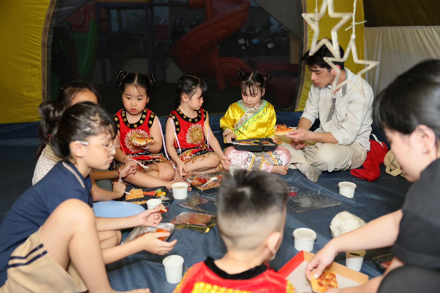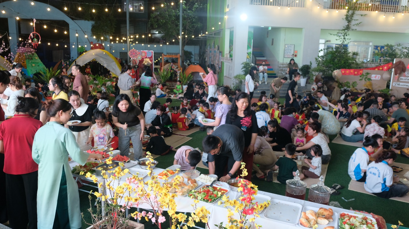 Giờ ăn trưa cũng thật đặc biệt – một bữa cơm dã ngoại ấm cúng do chính bố mẹ chuẩn bị, được các con thưởng thức ngay tại lều trại mang đậm chất Tây Nguyên của lớp mình. Những chiếc hộp cơm xinh xắn, những món ăn đầy yêu thương là sự tiếp nối trọn vẹn của một ngày hội ý nghĩa.