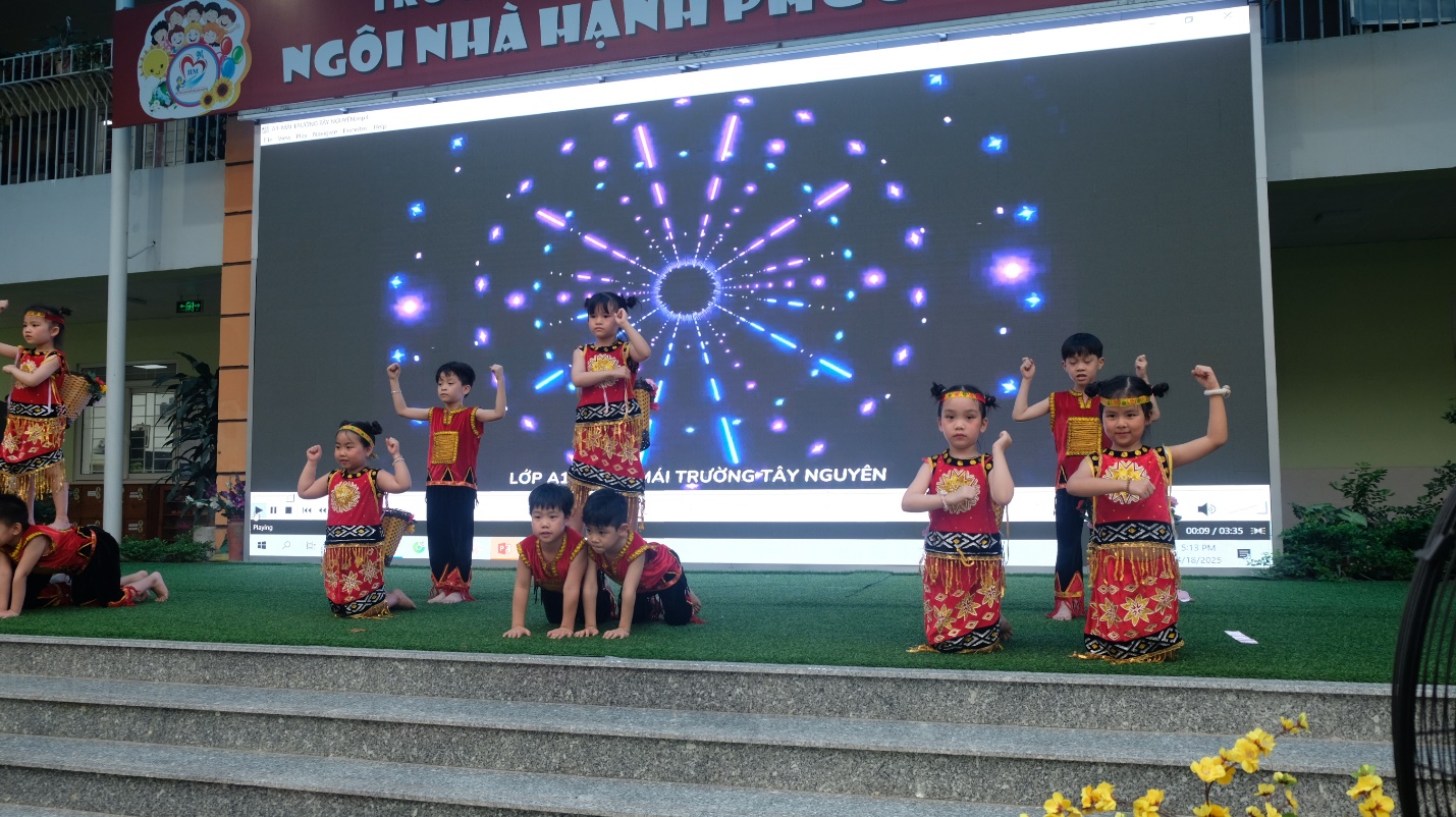 Buổi chiều, sân khấu lễ hội lại bừng sáng với phần biểu diễn văn nghệ. Các bé lớp A1 tự tin khoe tài qua điệu múa “Mái trường Tây Nguyên” – uyển chuyển, hồn nhiên và đầy cảm xúc.