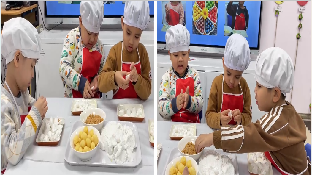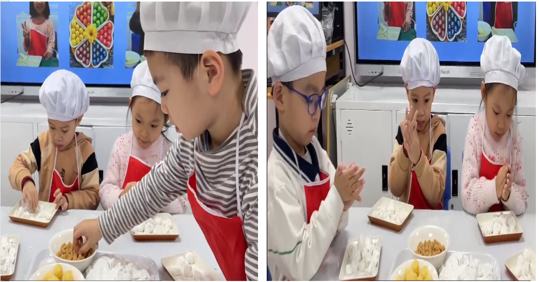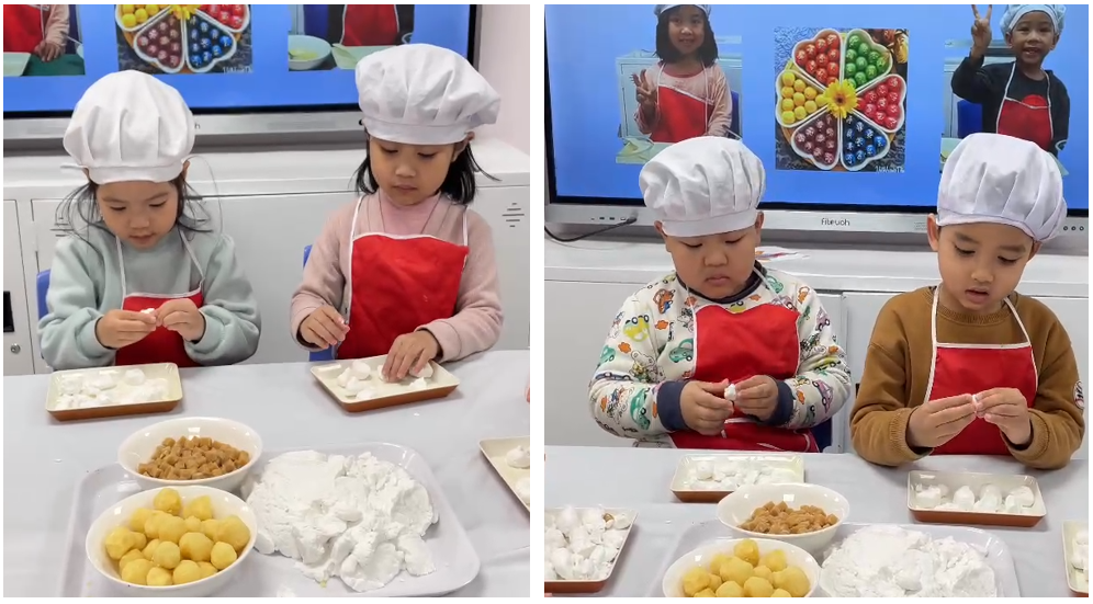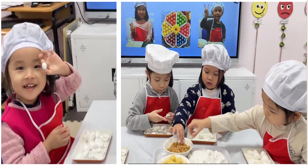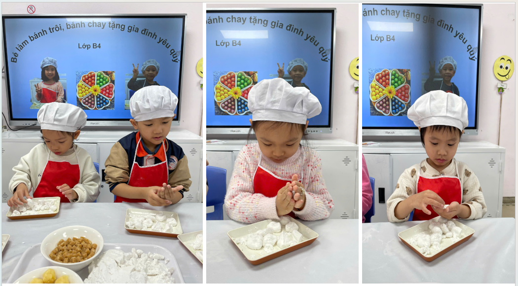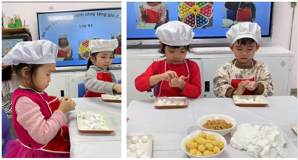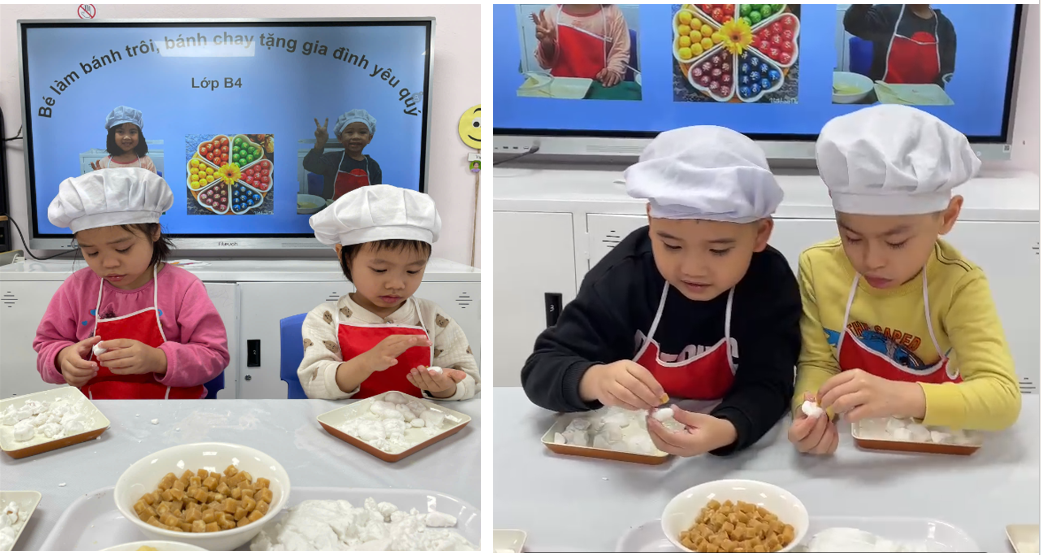 Sau khi được cô giáo hướng dẫn cách làm bánh trôi, bánh chay từ những nguyên liệu đơn giản như bột nếp, đậu xanh, đường phèn… Với đôi bàn tay nhỏ nhắn, các con khéo léo nhào bột, vo viên, nặn những chiếc bánh tròn trịa, xinh xắn. Mỗi chiếc bánh là một món quà ấm áp mà các con muốn dành tặng cho ông bà, bố mẹ và những người thân yêu. Trong mắt các con, chiếc bánh trôi, bánh chay không chỉ đơn thuần là một món ăn ngon, mà còn là món quà chứa đựng tình yêu thương, sự tôn trọng và lòng biết ơn đối với những người đã chăm sóc và nuôi dưỡng mình.
