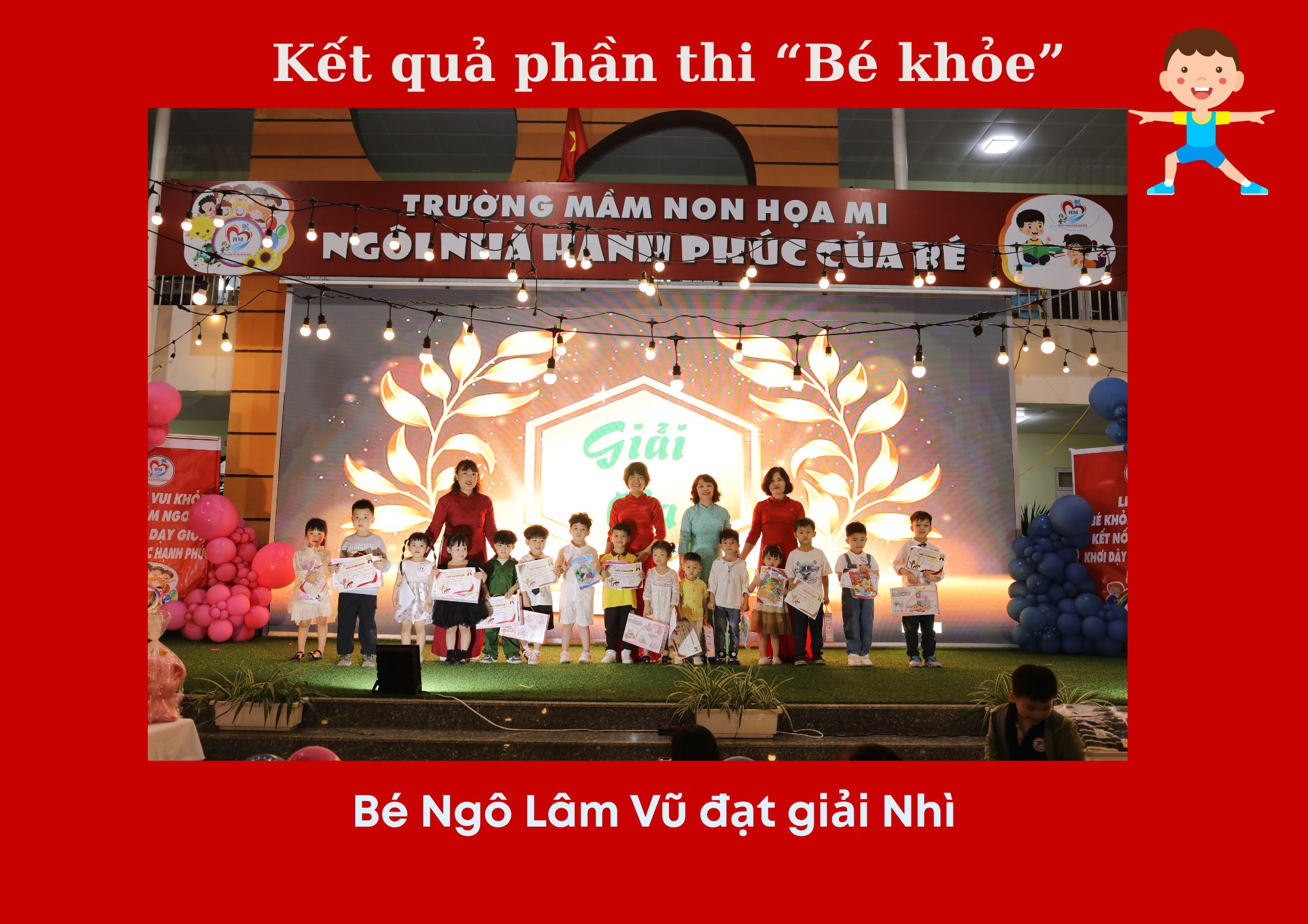 Vừa qua, các bé lớp A1 trường Mầm non Họa Mi đã tham gia hội thi "Bé khỏe - Bé đẹp" và gặt hái được những thành tích ấn tượng. Hội thi là sân chơi bổ ích, giúp các bé phát triển toàn diện cả về thể chất lẫn tinh thần, đồng thời tạo cơ hội để các con tự tin thể hiện bản thân.