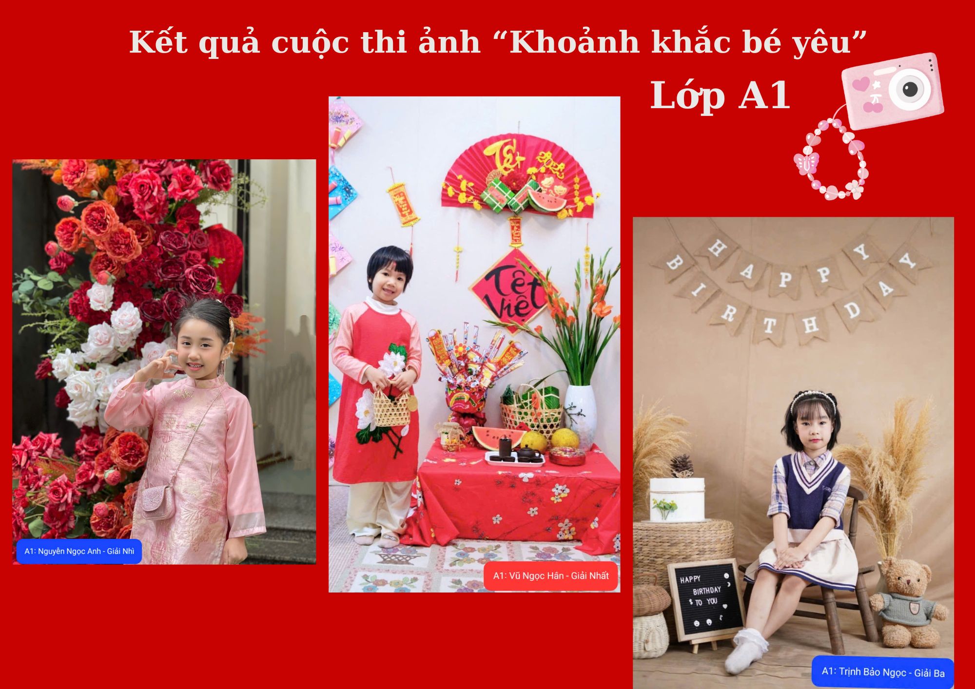 Phần thi ảnh đẹp "Khoảnh khắc bé yêu" đã ghi lại những hình ảnh đáng nhớ của các bé lớp A1 trong những khoảnh khắc tự nhiên nhất. Những nụ cười trong sáng, ánh mắt hồn nhiên của các con đã tạo nên những bức ảnh đầy cảm xúc. Kết quả: Bé Vũ Ngọc Hân đã giành giải Nhất, bé Nguyễn Ngọc Anh đạt giải Nhì và bé Trịnh Bảo Ngọc đạt giải Ba