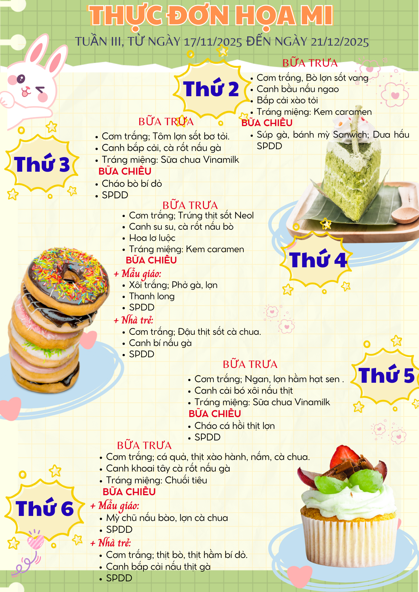 Thực đơn tuần 3 – của các bé trường Mầm non Họa Mi (Từ ngày 17/11/2025 – 21/12/2025)