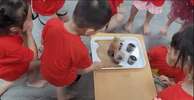 Tiếp theo, cô và các bé cùng làm thí nghiệm “Coca-Cola và Mentos”. Khi viên kẹo Mentos được thả vào chai Coca, dòng bọt phun mạnh lên khiến cả lớp ồ lên ngạc nhiên. Đây là khoảnh khắc vui nhất buổi học khi các bé vừa ngạc nhiên vừa cười vang cả lớp.
