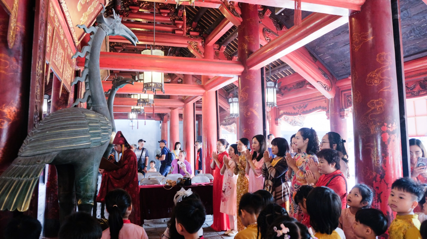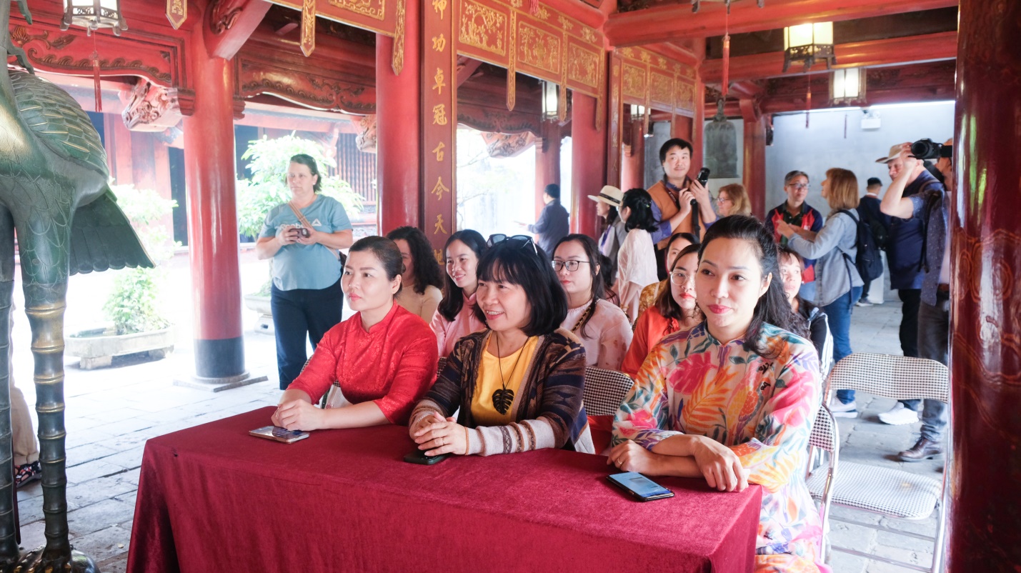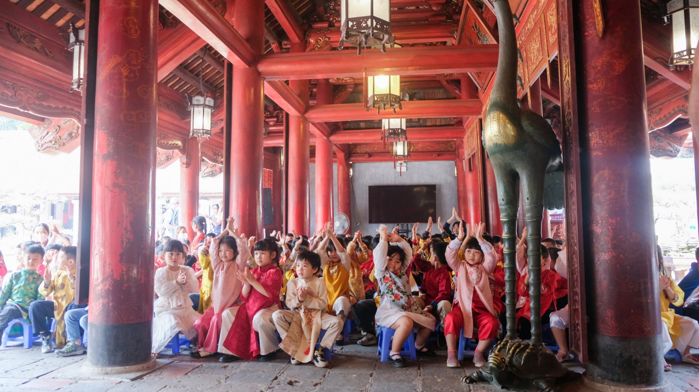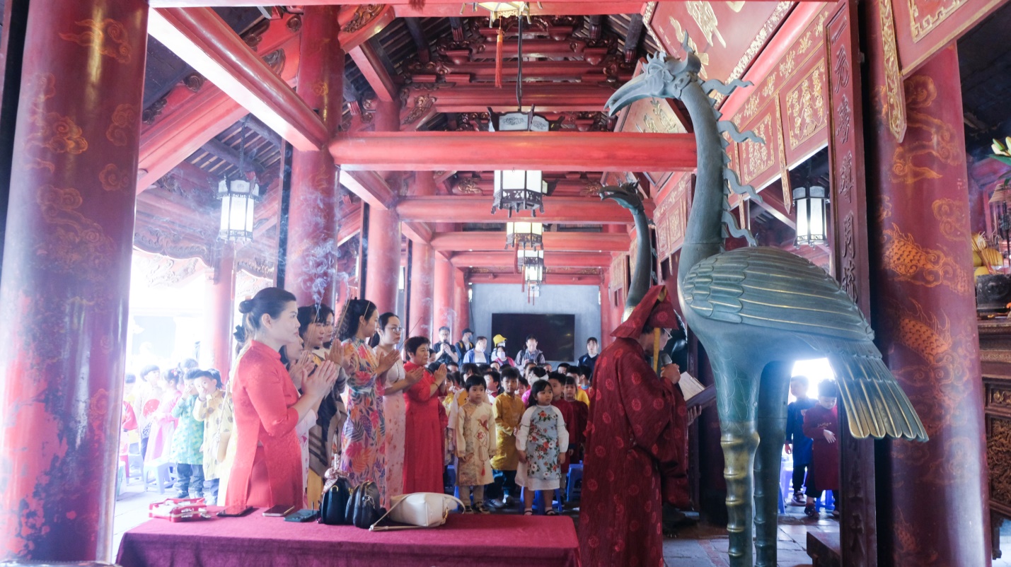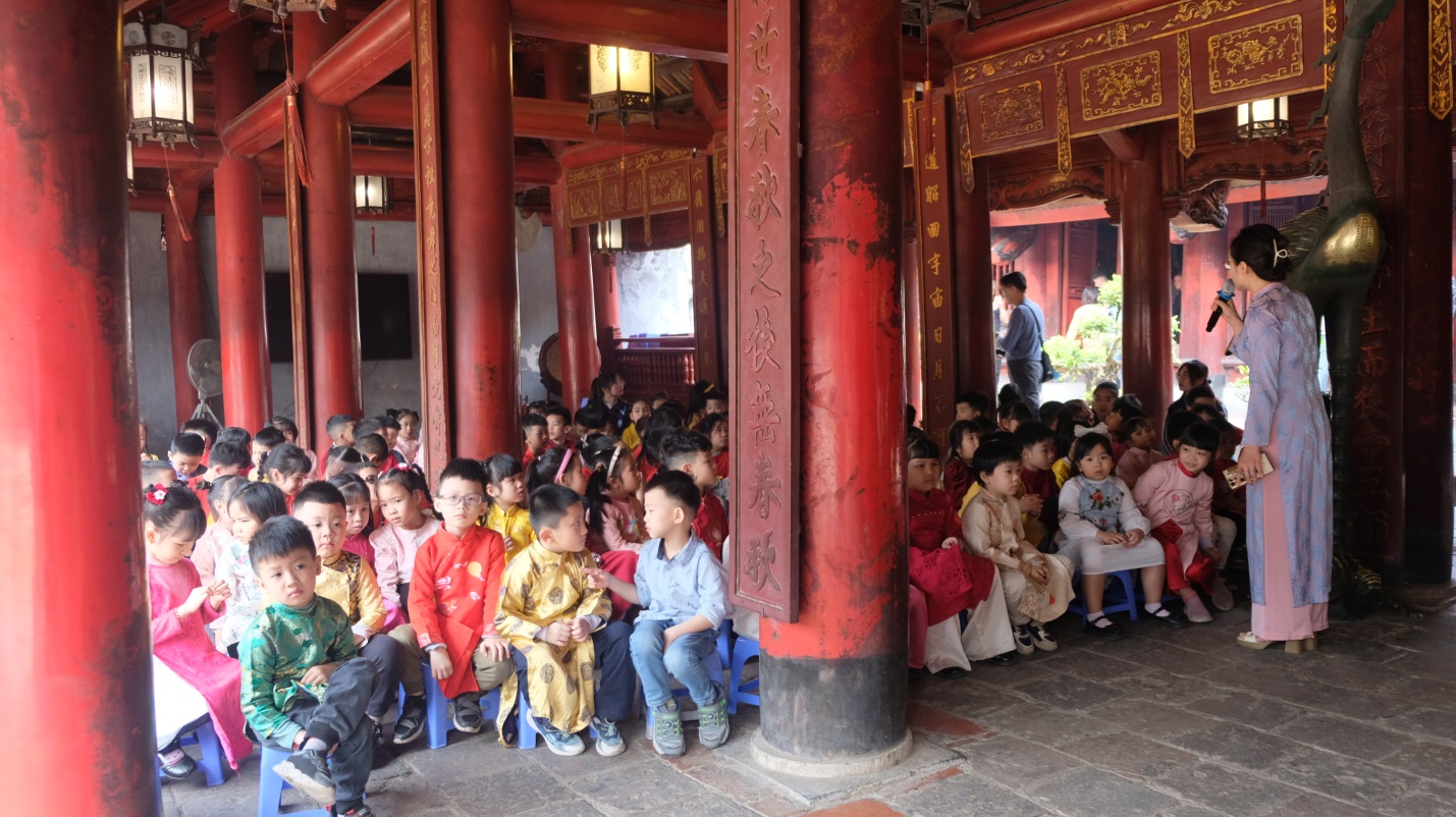 Sau lễ dâng hương, các bé được nghe giới thiệu về khu di tích Văn Miếu - Quốc Tử Giám. Với sự dẫn dắt của hướng dẫn viên, các bé hào hứng lắng nghe về lịch sử hình thành của Văn Miếu - Quốc Tử Giám, nơi được coi là trường đại học đầu tiên của Việt Nam. Những câu chuyện về các bậc hiền tài, về truyền thống học tập chăm chỉ và ý chí vươn lên trong học vấn đã để lại ấn tượng sâu sắc trong tâm hồn non nớt của các bé.