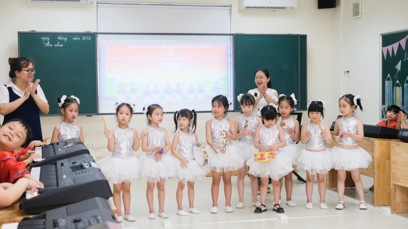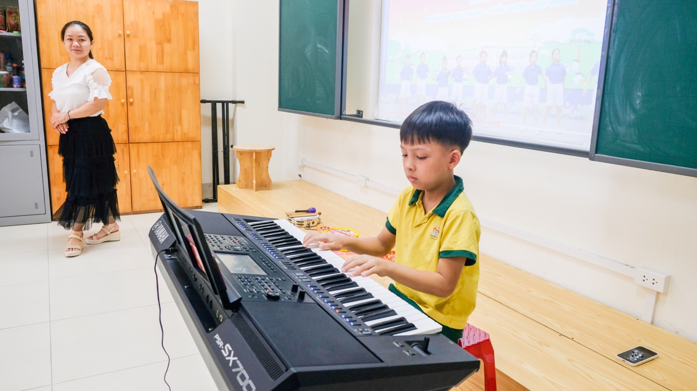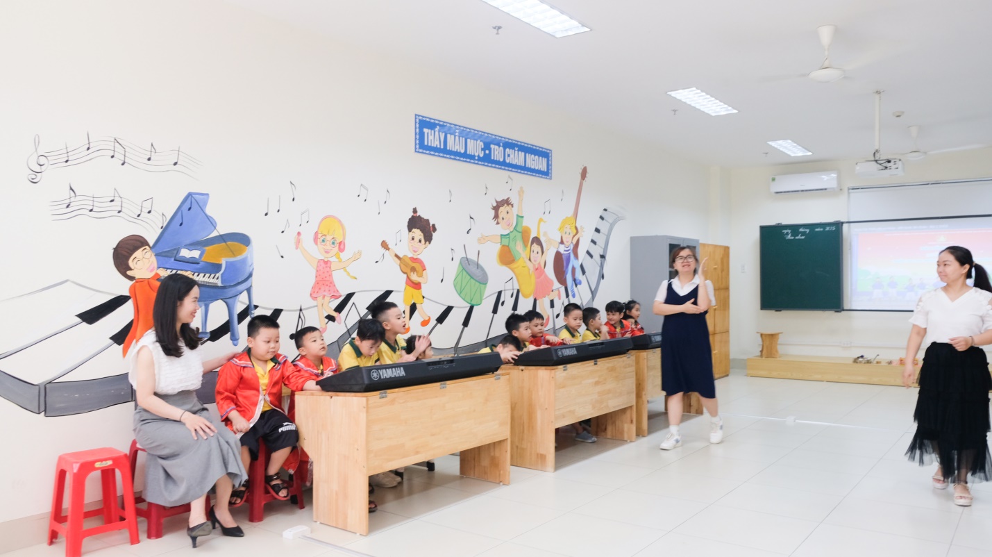 Không dừng lại ở đó, các bé còn được trải nghiệm trực tiếp các hoạt động thú vị tại các phòng chức năng của nhà trường như: phòng âm nhạc, phòng thể chất và phòng nghệ thuật. Tại phòng âm nhạc, các bé chăm chú lắng nghe những giai điệu vui tươi, tự tin hát theo và nhún nhảy theo nhạc.