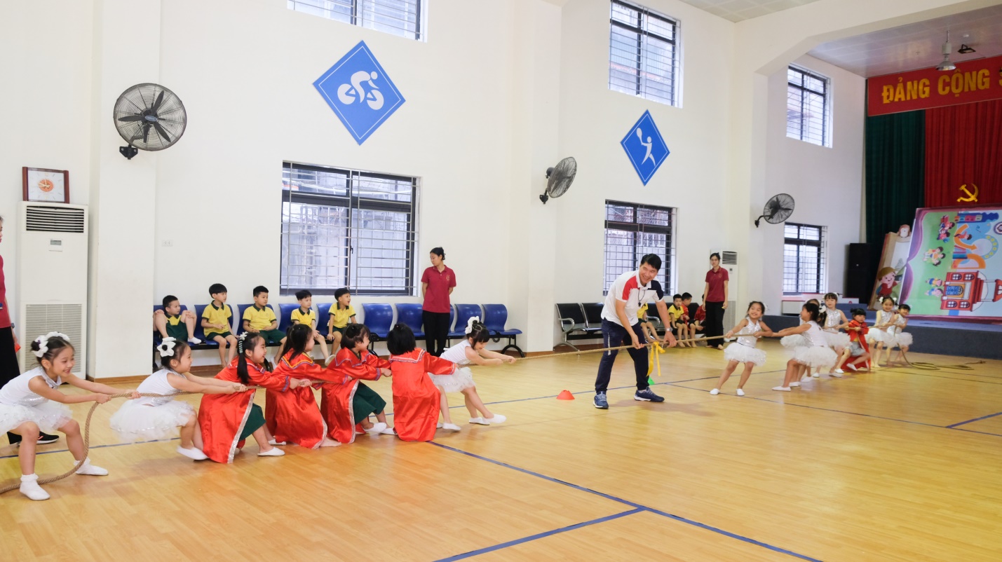 Sang đến phòng thể chất, các con không giấu nổi sự hào hứng khi được tham gia những trò chơi vận động vui nhộn: kéo co.