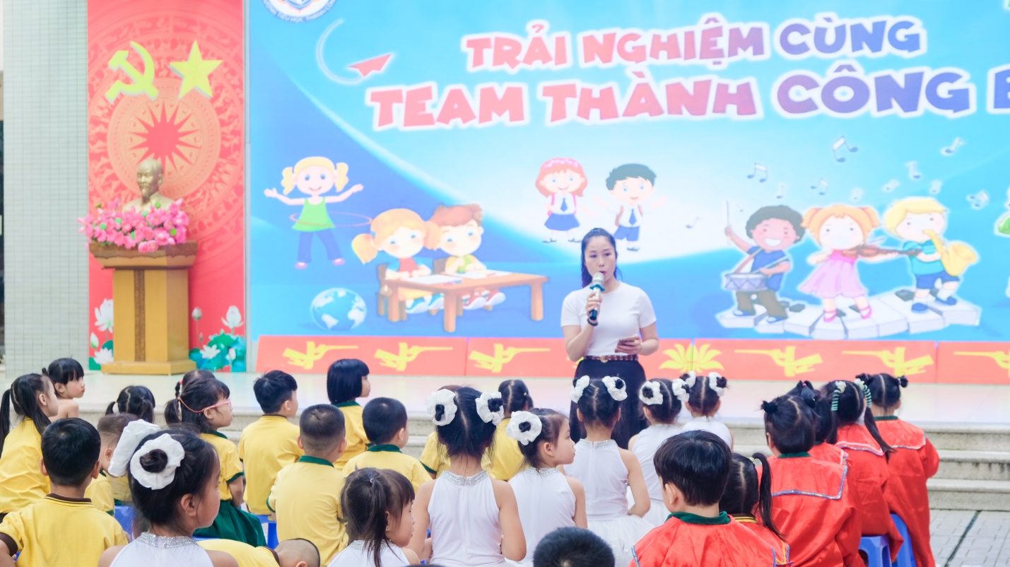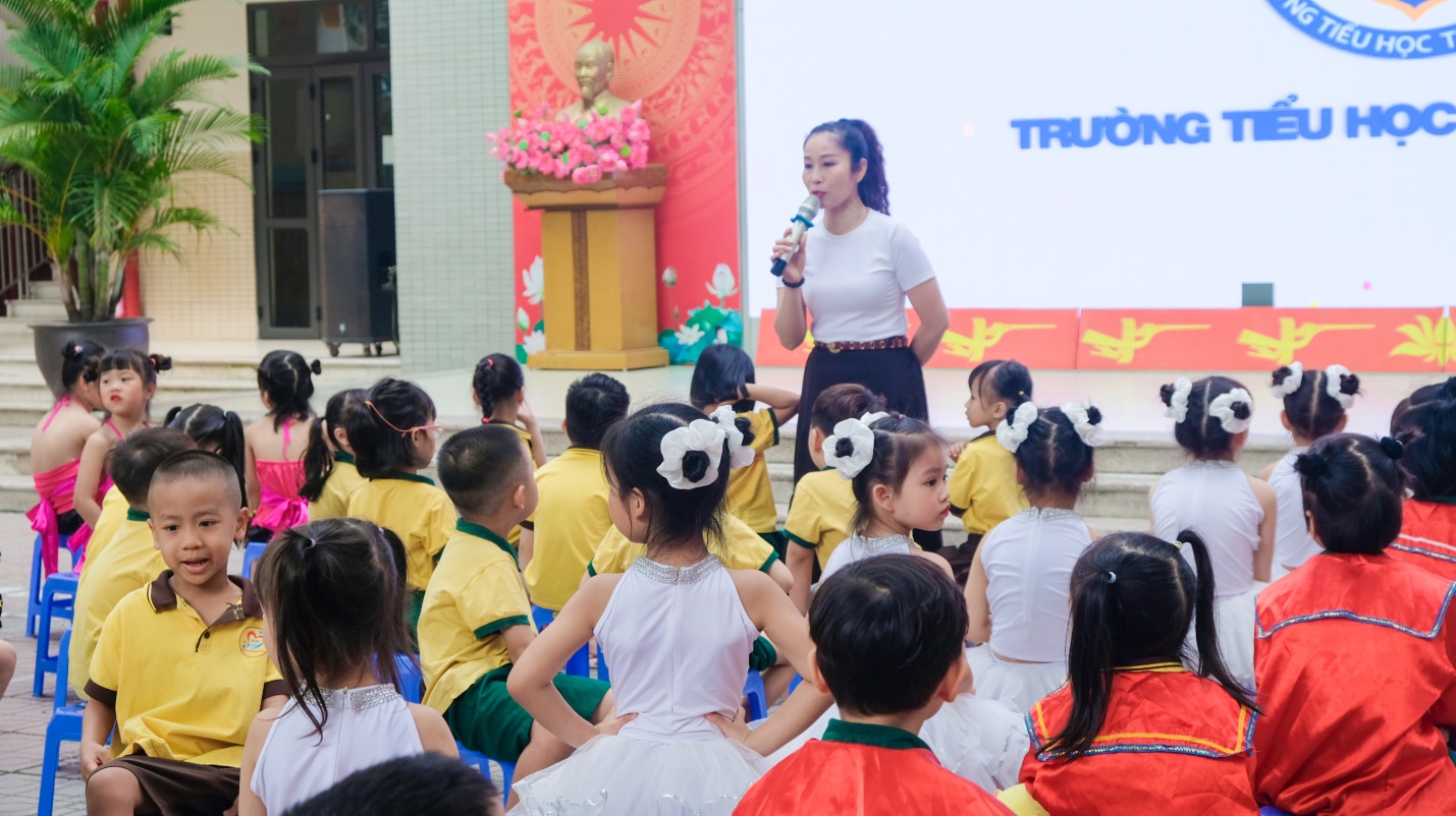 Cô Đào Thị Thái, tổng phụ trách của trường Tiểu học Thành Công B giới thiệu với các con về ngôi trường của mình