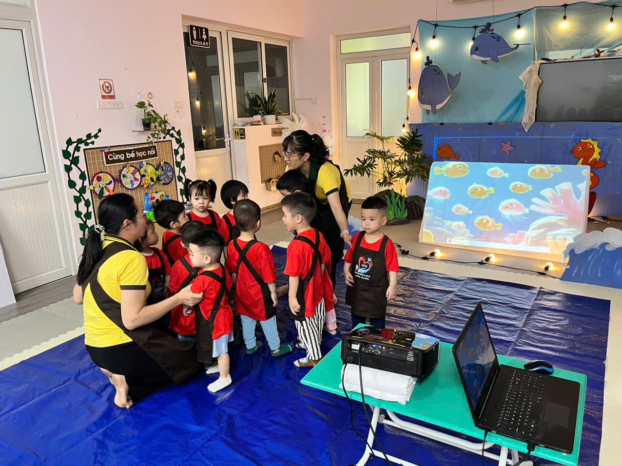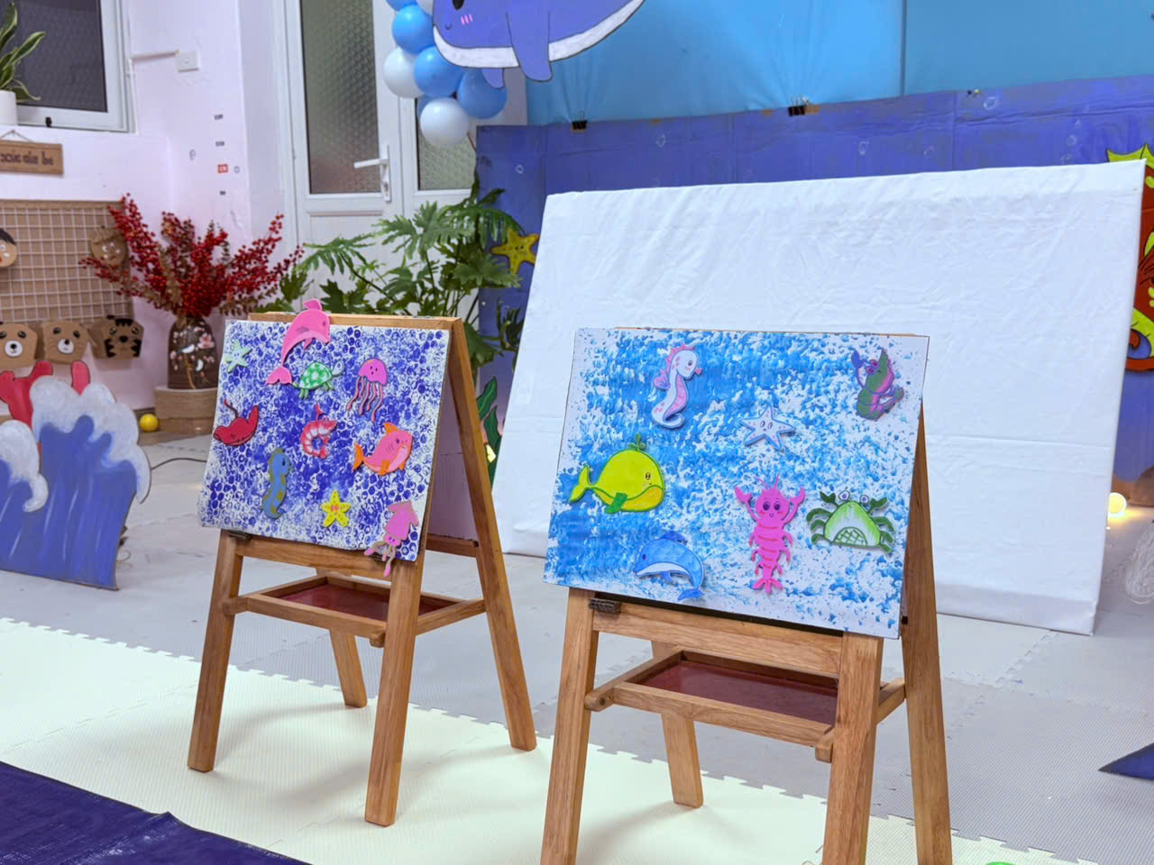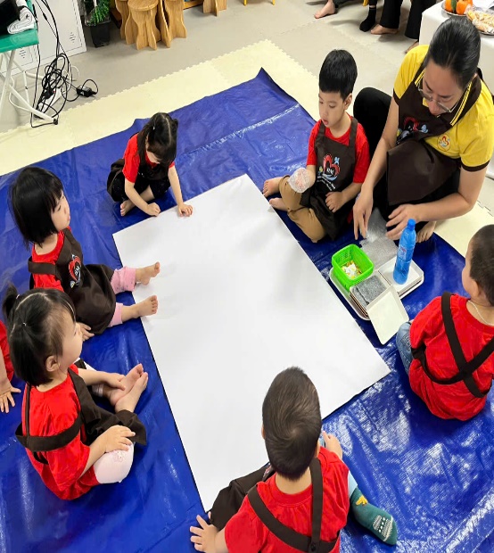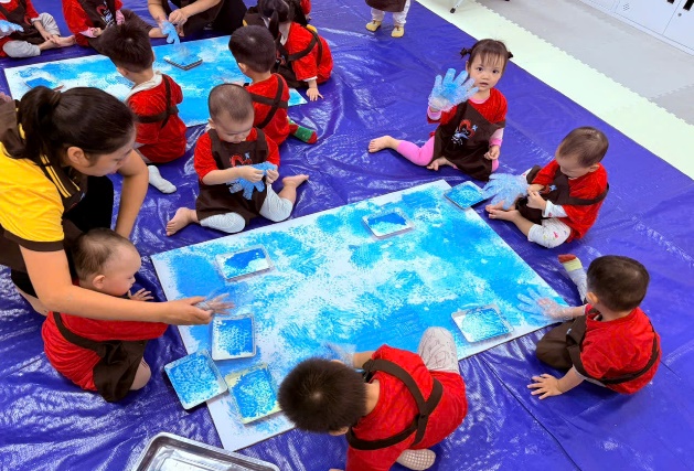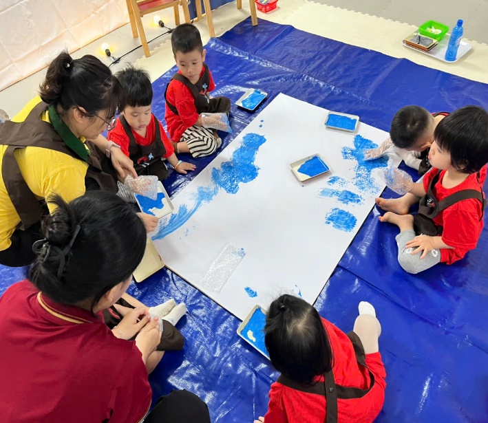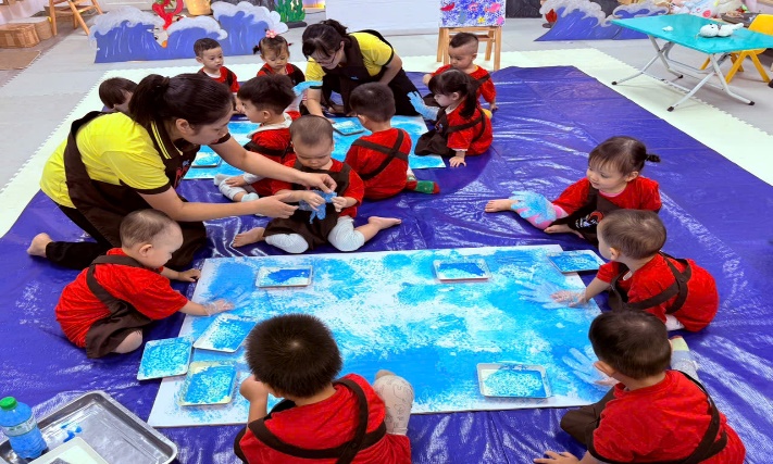 Những cái chạm đầu đời: Các con được làm quen với màu nước, học cách vỗ nhẹ bàn tay để tạo nên một đại dương rộng lớn và xanh mát.