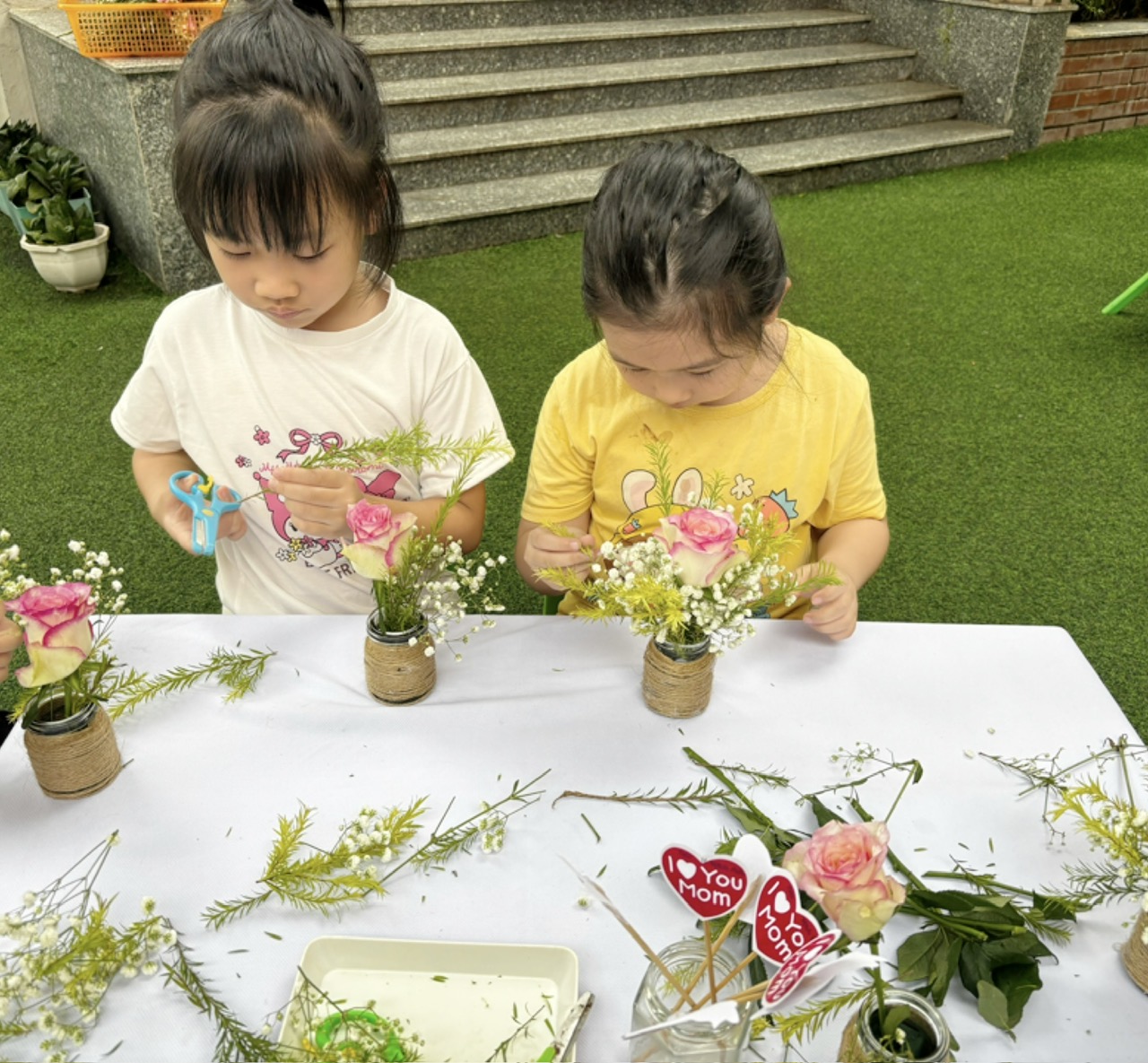 Bé cắm hoa tặng bà và mẹ