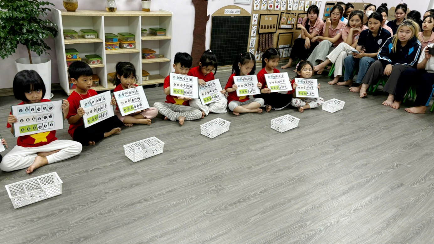 Cô giáo Đỗ Thủy lớp A2 đã có nhiều năm kinh nghiệm giảng dạy lớp mẫu giáo 5 tuổi được cử thực hiện họat động “ Làm quen chữ E, Ê” cho các em giáo sinh kiến tập. Hoạt động làm quen chữ cái là một trong những hoạt động vô cùng quan trọng trong quá trình phát triển của trẻ. Cho trẻ mẫu giáo 5 tuổi làm quen với chữ cái không chỉ nhằm giúp trẻ biết được các mặt chữ cái và để phát âm chính xác khi nói mà còn tạo ra cho trẻ hứng thú học tiếng mẹ đẻ, làm tiền đề cho trẻ thích ứng với việc đọc viết ở lớp 1. Thông qua hoạt động làm quen chữ cái, trẻ được phát âm đúng 29 chữ cái tiếng việt, đồng thời giúp trẻ phát triển khả năng ghi nhớ có chủ định,…