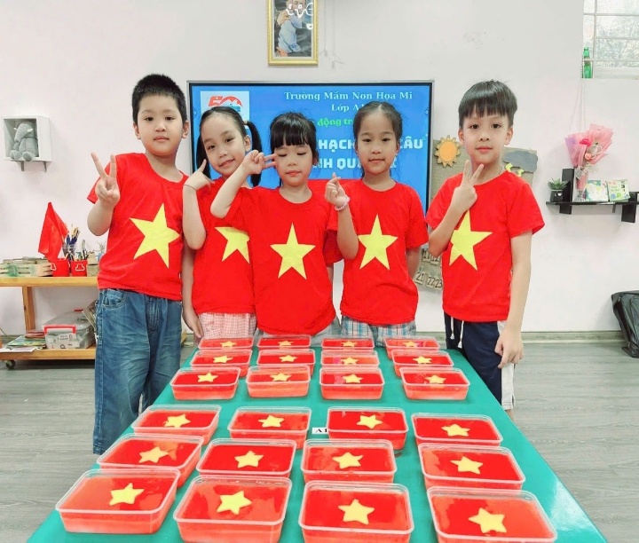 Bên cạnh những hoạt động mang tính trang trọng và giáo dục, các cô giáo Trường Mầm non Họa Mi còn khéo léo lồng ghép những hoạt động vui tươi, sáng tạo để các bé có thể tiếp thu kiến thức một cách tự nhiên và hứng thú. Hoạt động xếp hình đất nước Việt Nam và hình lá cờ đỏ sao vàng giúp các bé nhận diện và thêm yêu quý bản đồ và biểu tượng thiêng liêng của Tổ quốc. Tiết mục nhảy flashmob bài hát "Như có Bác Hồ trong ngày vui đại thắng" và "Việt Nam ơi" đã tạo nên một không khí sôi động, hào hứng, thể hiện niềm vui và tình yêu đối với đất nước. Đặc biệt, hoạt động làm thạch hình lá cờ đất nước không chỉ mang tính thẩm mỹ, sáng tạo mà còn là một cách tuyệt vời để các bé ghi nhớ hình ảnh lá cờ Tổ quốc một cách sâu sắc. Xem video Tại đây