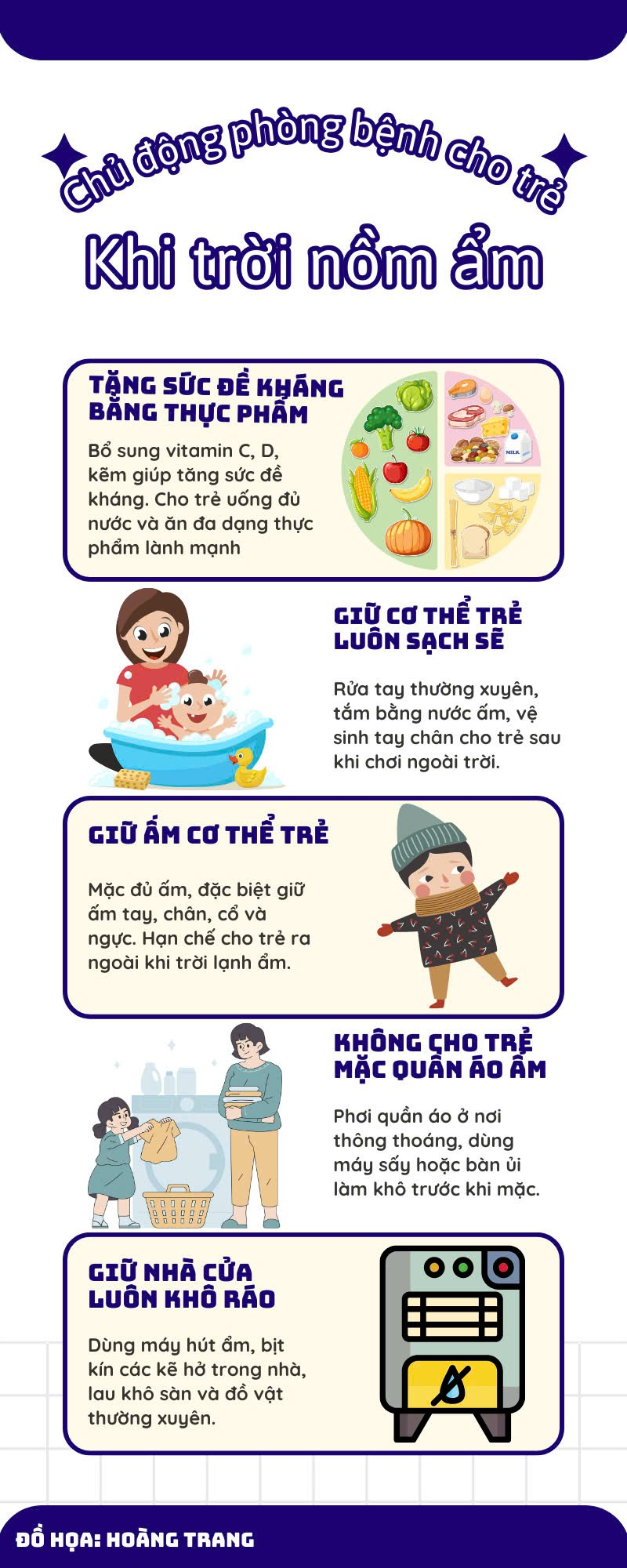 3. Chế độ ăn uống và sinh hoạt Ăn chín, uống sôi: Đảm bảo dinh dưỡng đủ chất, tăng cường rau xanh, trái cây giàu vitamin để tăng sức đề kháng. Chăm sóc giấc ngủ: Đảm bảo phòng ngủ khô thoáng, giữ ấm bàn chân bằng cách đi tất khi ngủ. Hạn chế ra ngoài: Tránh cho trẻ ra ngoài trời vào sáng sớm hoặc tối muộn khi độ ẩm cao.