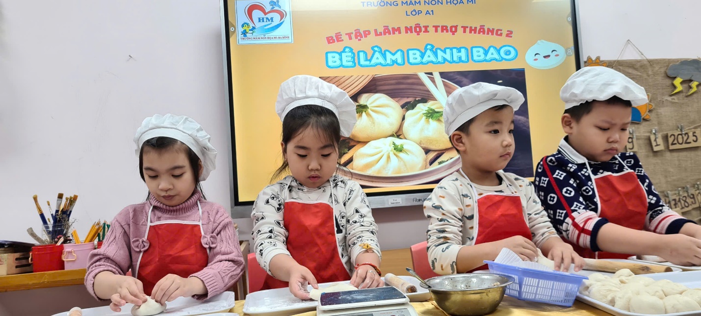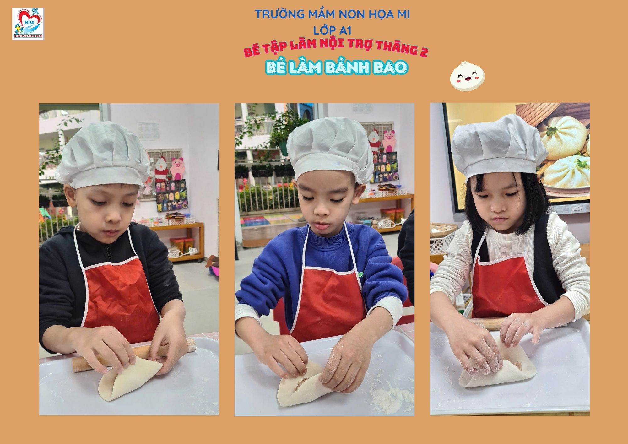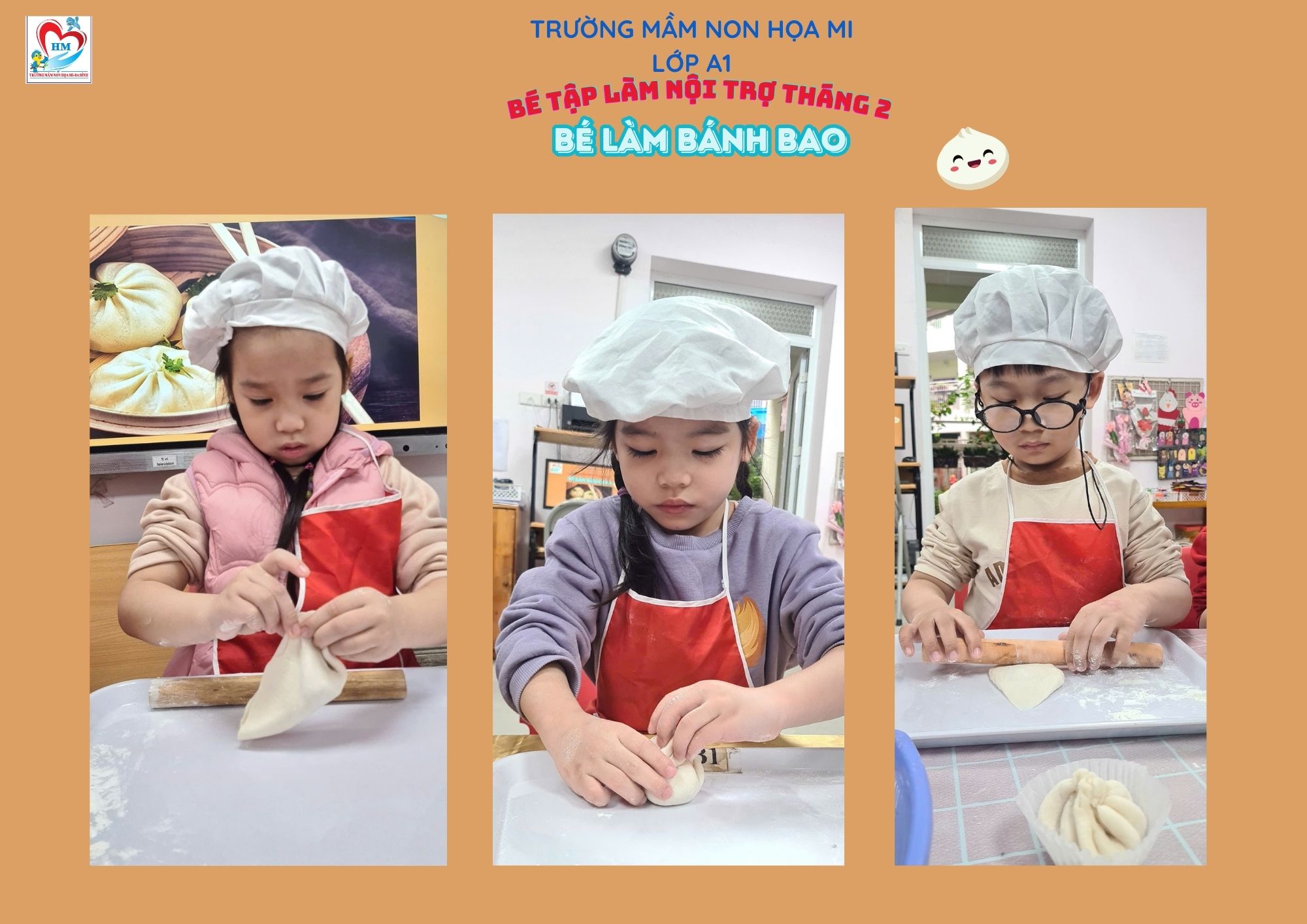 Hôm nay, các bé lớp mẫu giáo lớn A1 đã có một trải nghiệm vô cùng thú vị khi được học làm bánh bao dưới sự hướng dẫn tận tình của cô Thu – một thợ làm bánh chuyên nghiệp. Hoạt động này không chỉ mang lại niềm vui mà còn giúp các bé rèn luyện sự khéo léo và hiểu thêm về quy trình làm ra một chiếc bánh thơm ngon.