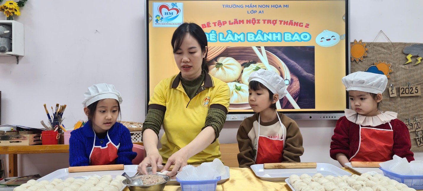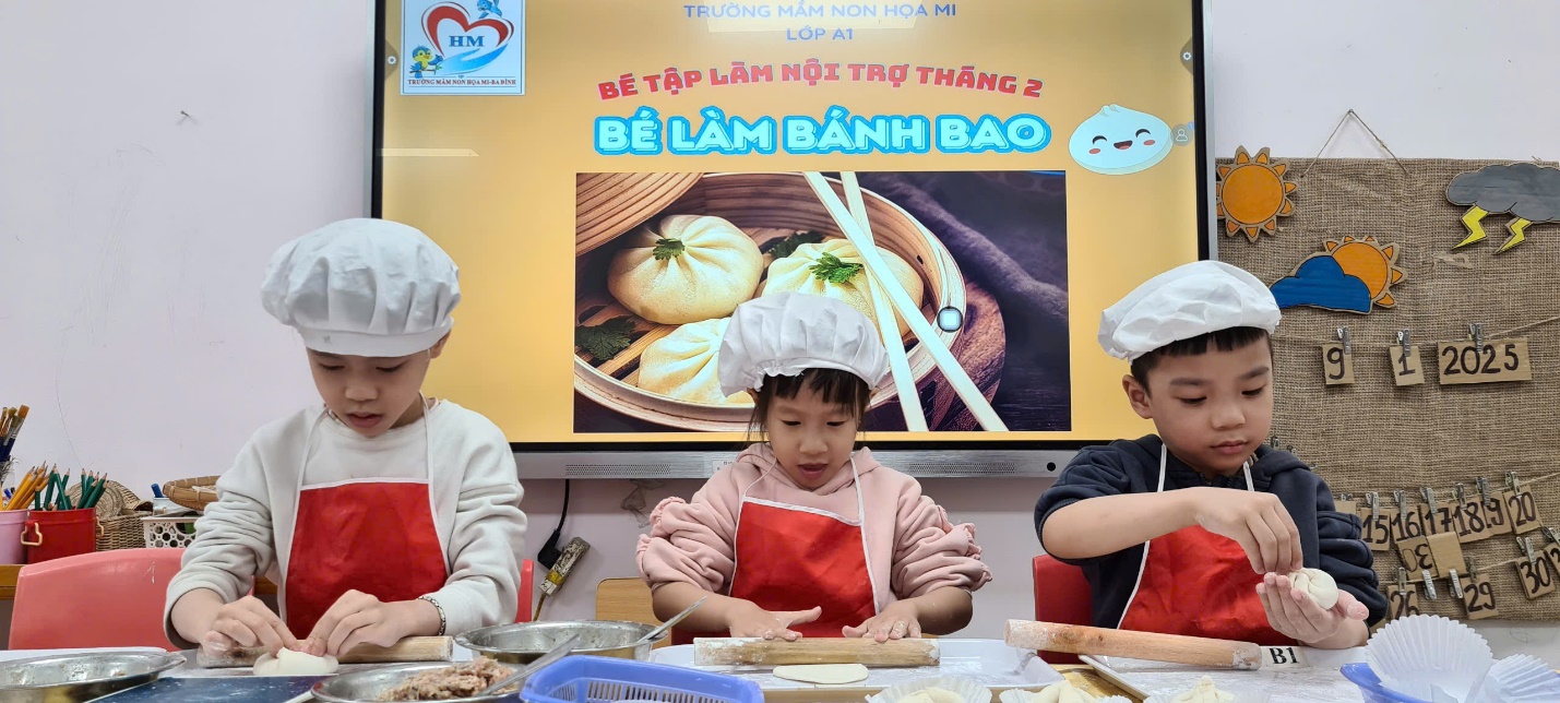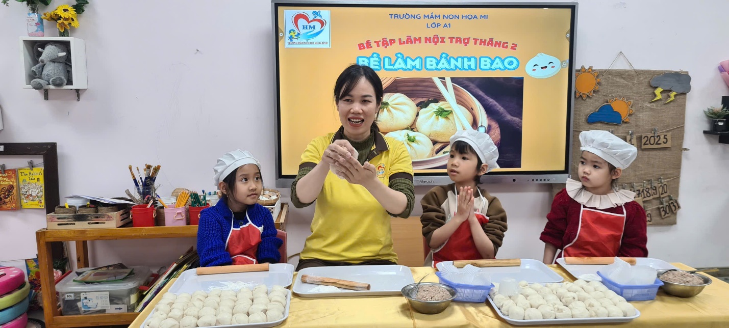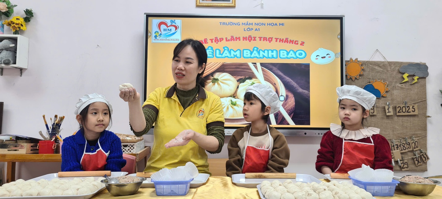 Hôm nay, các bé lớp mẫu giáo lớn A1 đã có một trải nghiệm vô cùng thú vị khi được học làm bánh bao dưới sự hướng dẫn tận tình của cô Thu – một thợ làm bánh chuyên nghiệp. Hoạt động này không chỉ mang lại niềm vui mà còn giúp các bé rèn luyện sự khéo léo và hiểu thêm về quy trình làm ra một chiếc bánh thơm ngon.