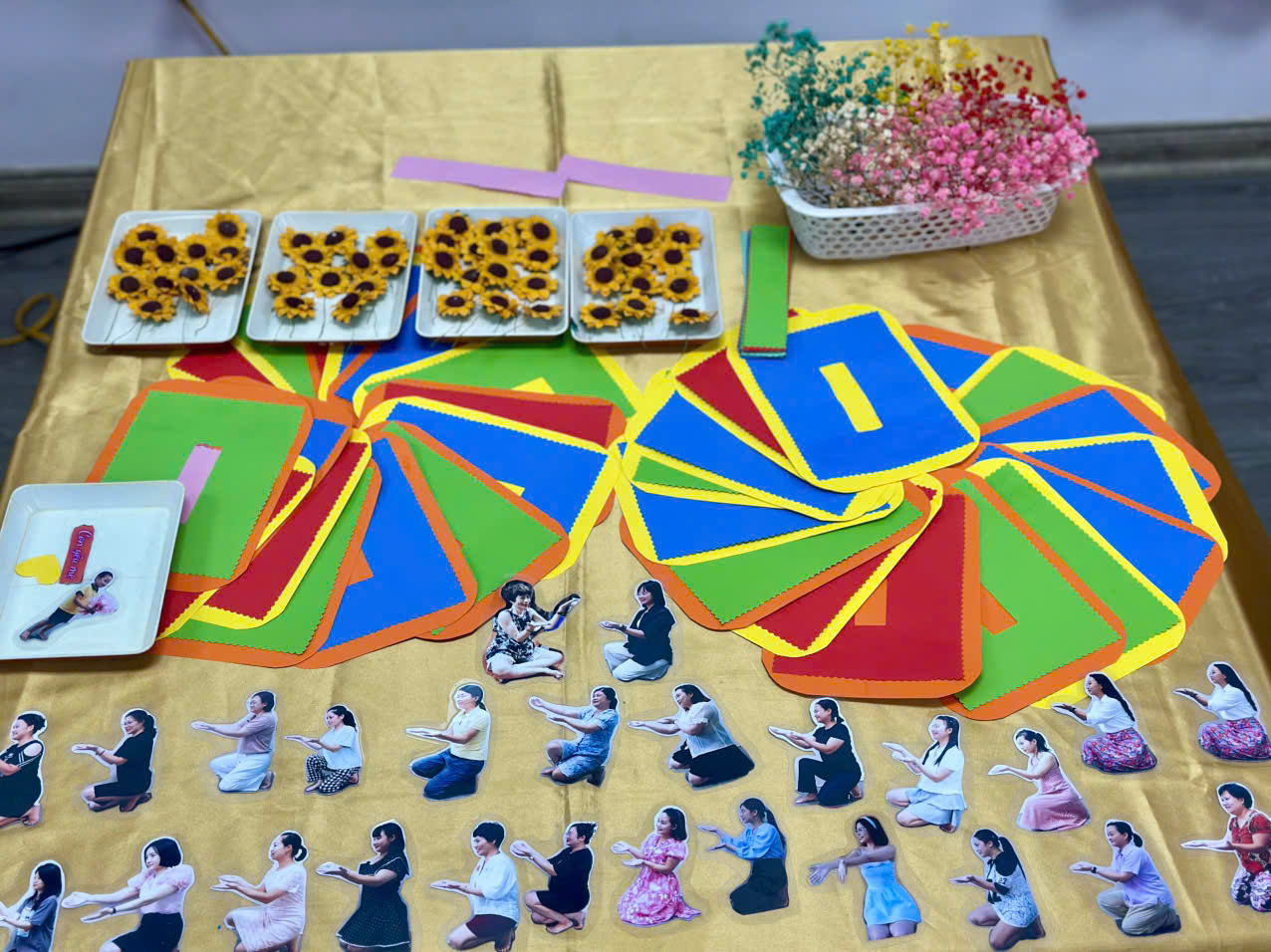 Ngay từ buổi sáng, lớp học nhỏ A5 đã trở nên rộn ràng hơn thường ngày. Trên bàn là những nguyên vật liệu xinh xắn mà cô đã chuẩn bị sẵn: ảnh của mẹ và con, những bông hoa khô, giấy màu, keo dán cùng những tấm thiệp chờ bàn tay khéo léo của các bé trang trí.