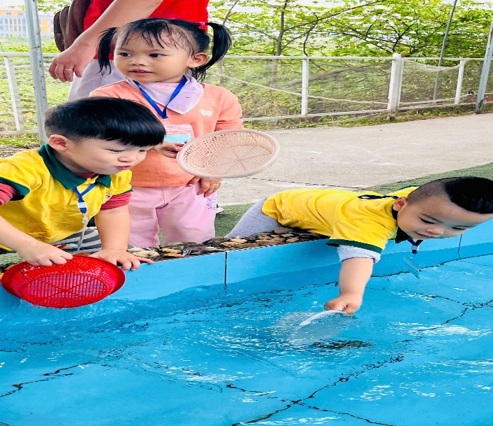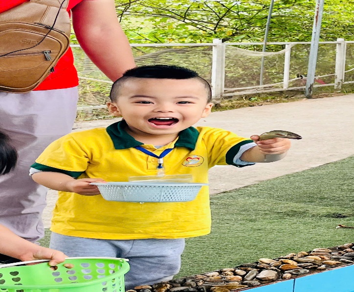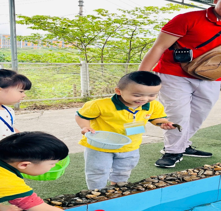 Không thể thiếu những giây phút thư giãn cạnh con suối nhỏ. Các bé được thử sức làm ngư dân nhí bắt cá. Những bàn tay nhỏ bé háo hức đưa lưới bắt cá, mang đến một cảm giác hòa mình vào thiên nhiên đầy tươi mới và dễ chịu.