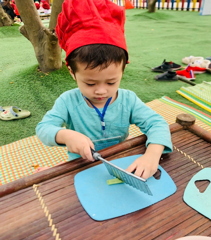Chuyến đi bắt đầu với hoạt động "Đầu bếp nhí" thú vị, nơi các bé được hóa thân thành những đầu bếp thật sự. Dưới sự hướng dẫn nhiệt tình của các cô chú tại trung tâm, các bé được trải nghiệm việc chuẩn bị nguyên liệu cho món cơm rang. Mặc dù những lát cà rốt và dưa chuột còn hơi vụn vặt, nhưng các bé đều vui mừng vì có thể tự tay làm ra món ăn.