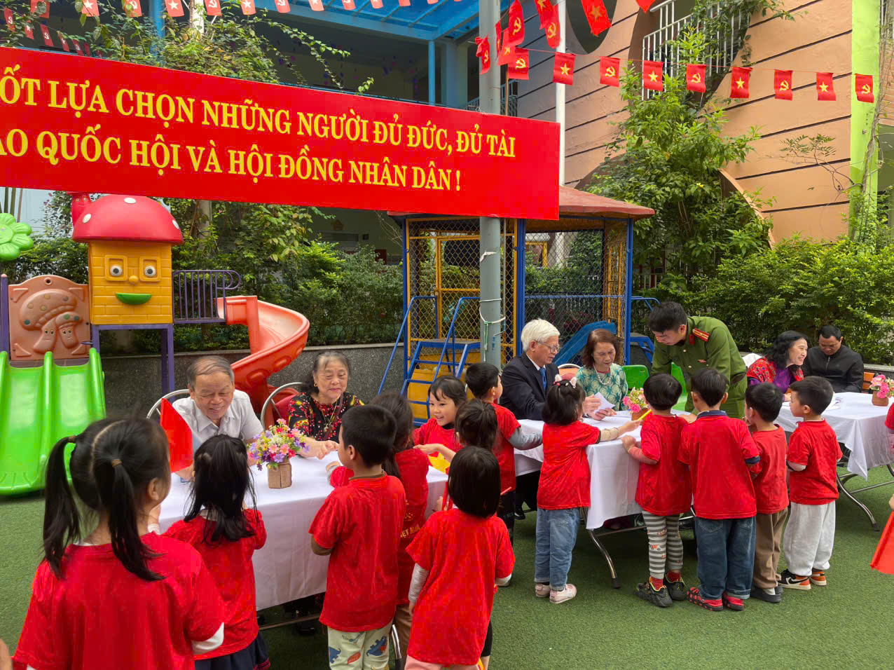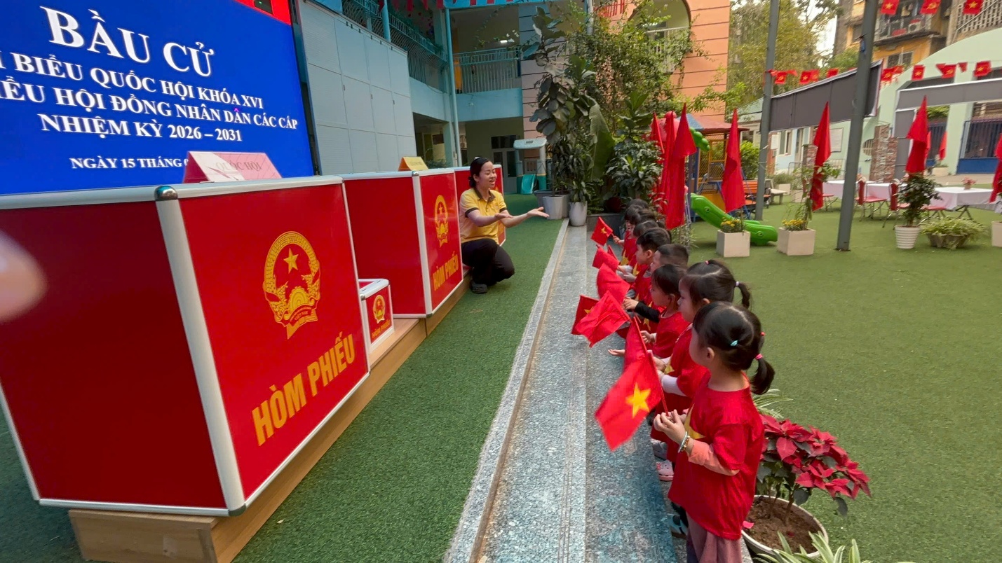 Đặc biệt, trong không khí rộn ràng ấy, các bé được gặp gỡ và chào đón các bác trong Ban bầu cử của tổ dân phố khi các bác đến kiểm tra và chuẩn bị cho ngày hội lớn. Những lời chào lễ phép, những nụ cười hồn nhiên của các bé đã góp phần làm cho không khí thêm ấm áp, gần gũi. Qua đó, các bé cũng được giáo dục về tinh thần tôn trọng, lễ phép và sự quan tâm tới các hoạt động chung của cộng đồng.