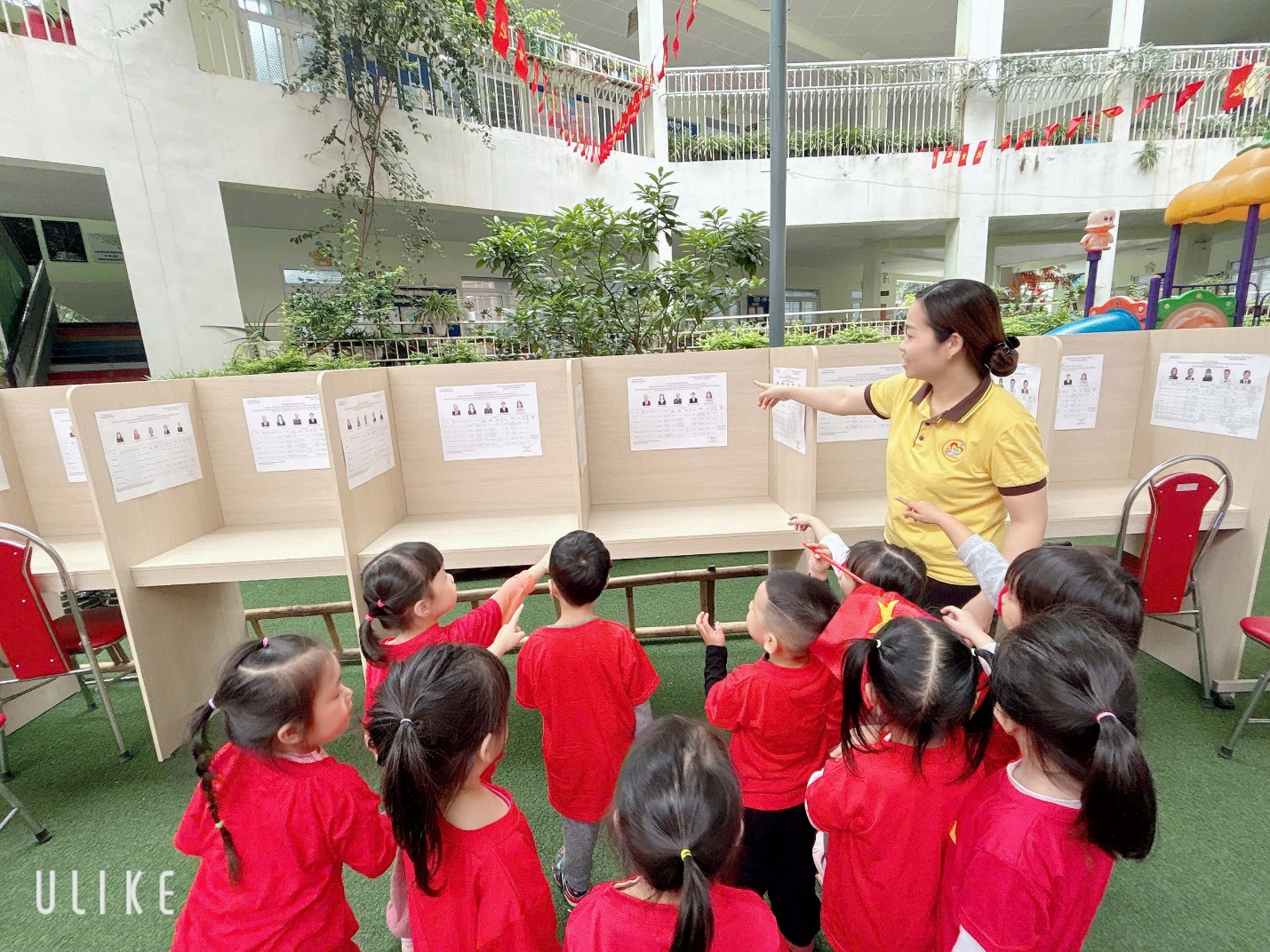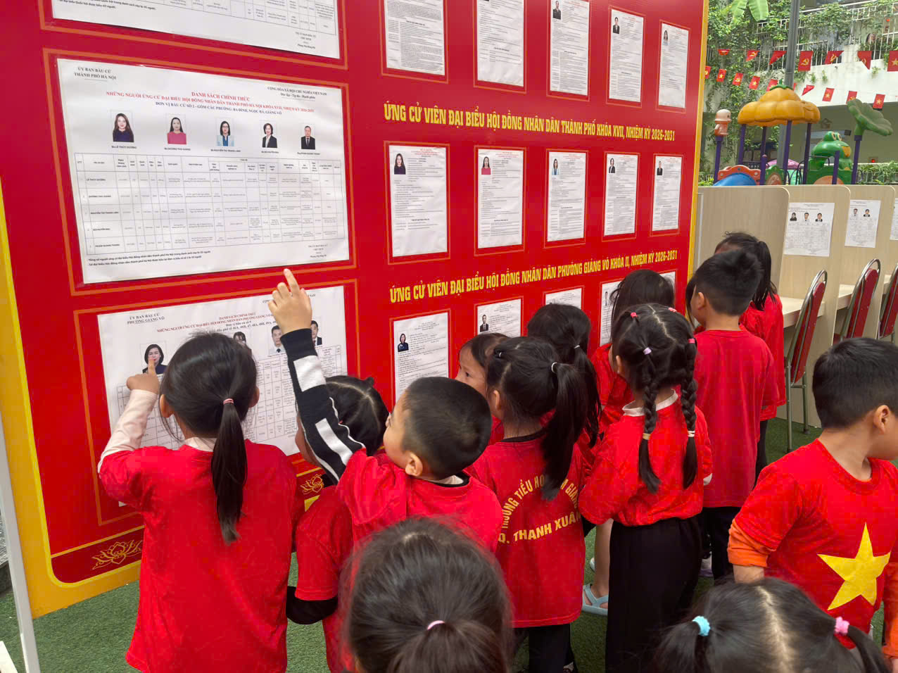 Không chỉ dừng lại ở việc tìm hiểu qua hình ảnh, cô và trò cùng nhau xuống sân trường để trực tiếp quan sát khu vực chuẩn bị cho ngày bầu cử. Tại đây, các bé được tìm hiểu về hòm phiếu, nơi lưu giữ những lá phiếu thể hiện niềm tin và trách nhiệm của cử tri. Các bé cũng được quan sát danh sách cử tri được niêm yết ngay ngắn, cũng như khu vực bầu cử được chuẩn bị chu đáo, trang nghiêm.