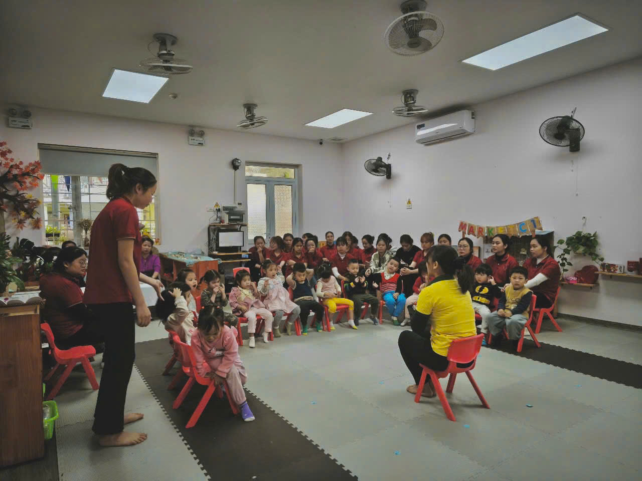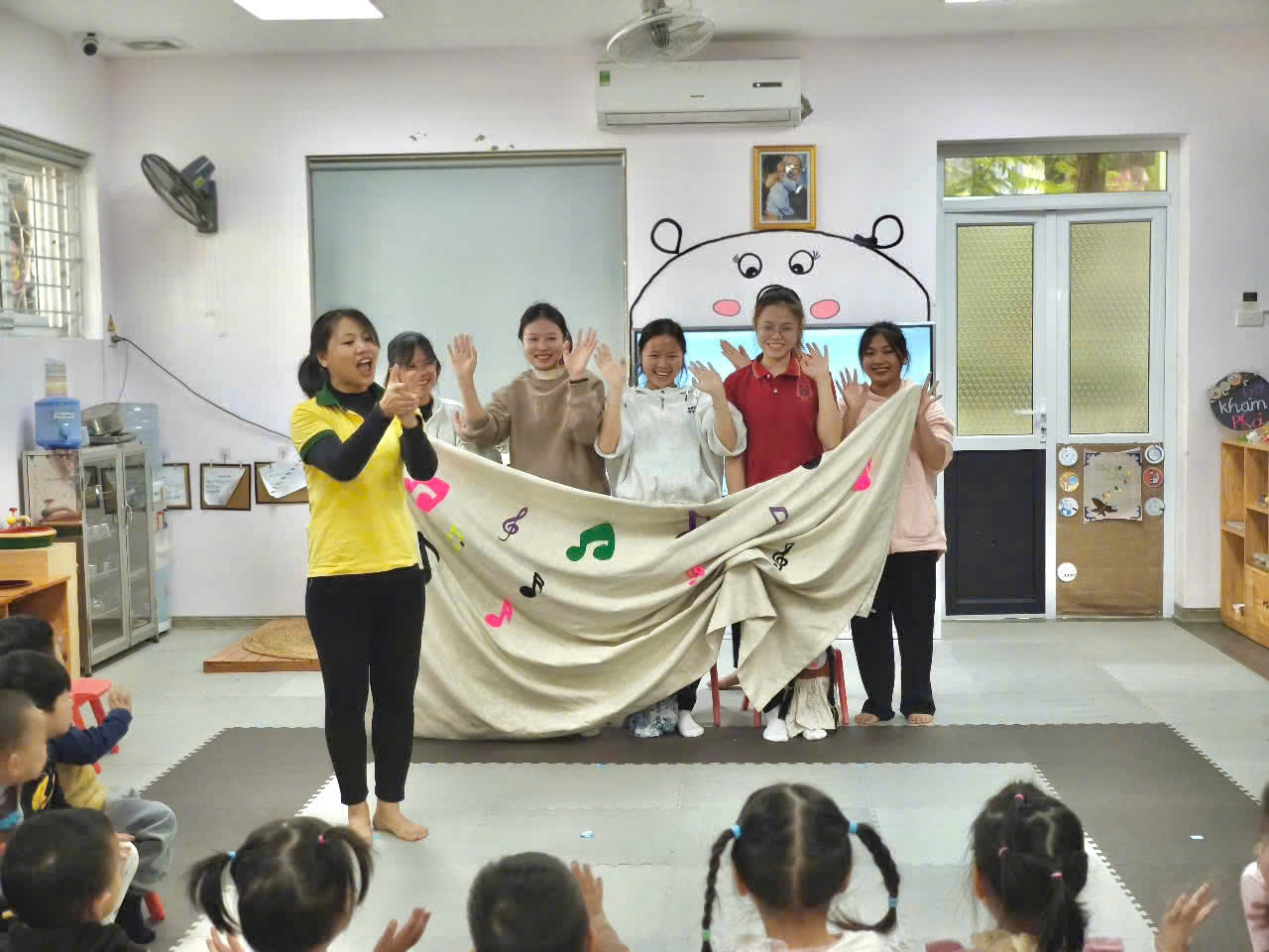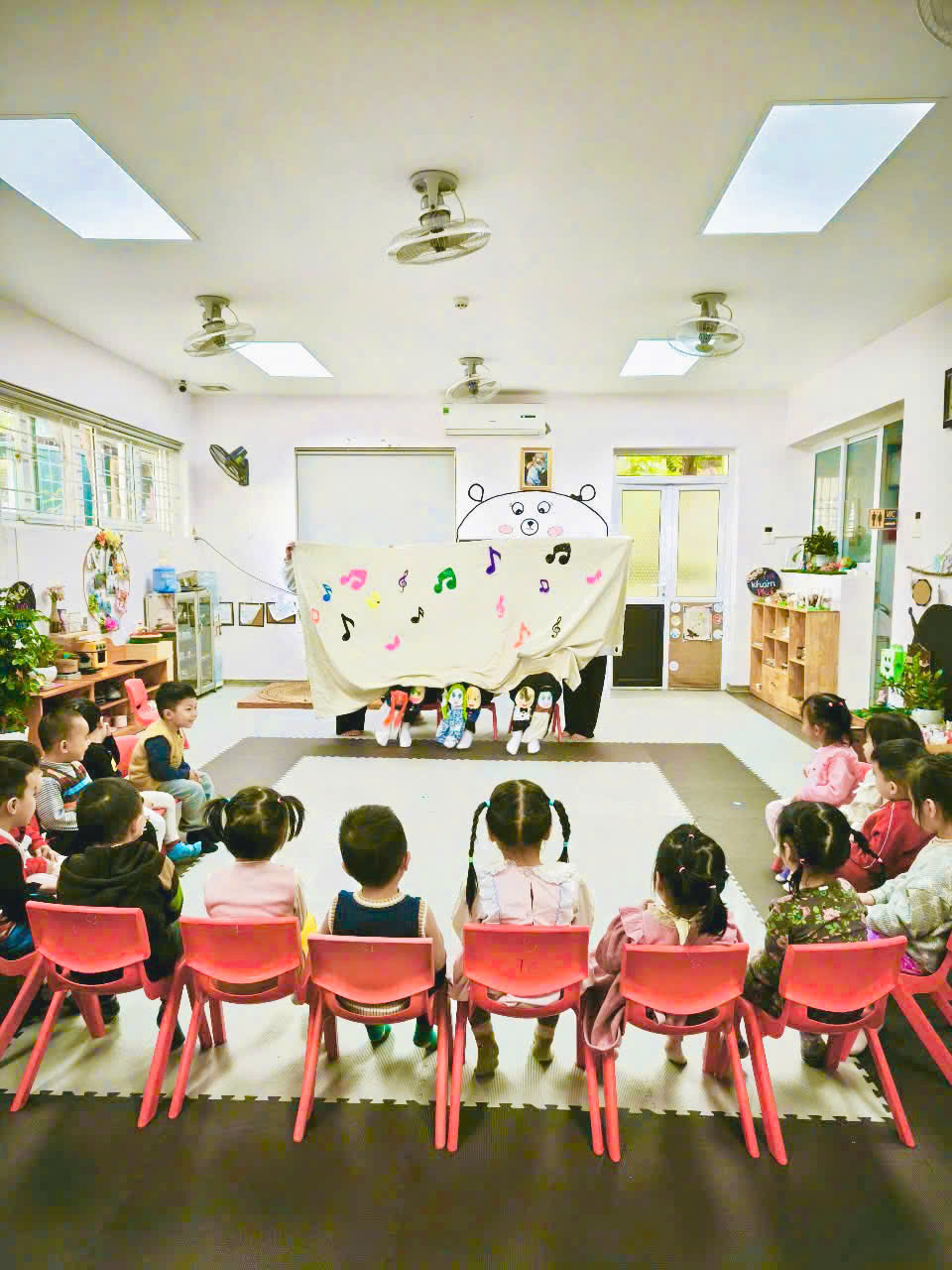 Các bé không chỉ hào hứng theo dõi mà còn tham gia vào hoạt động tương tác, như vỗ tay theo nhịp, cùng hát theo bài hát hoặc trả lời những câu hỏi gợi mở của cô giáo: