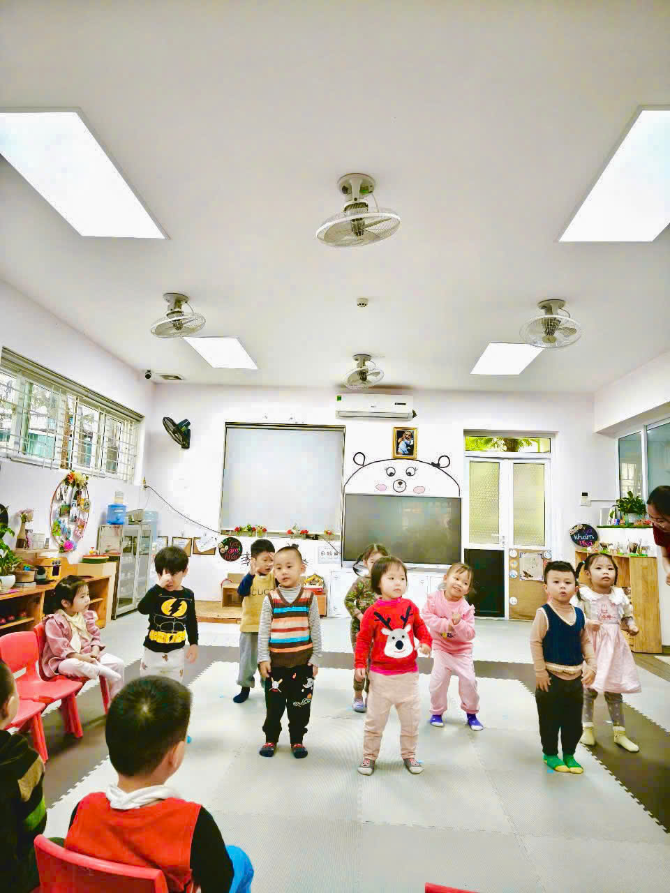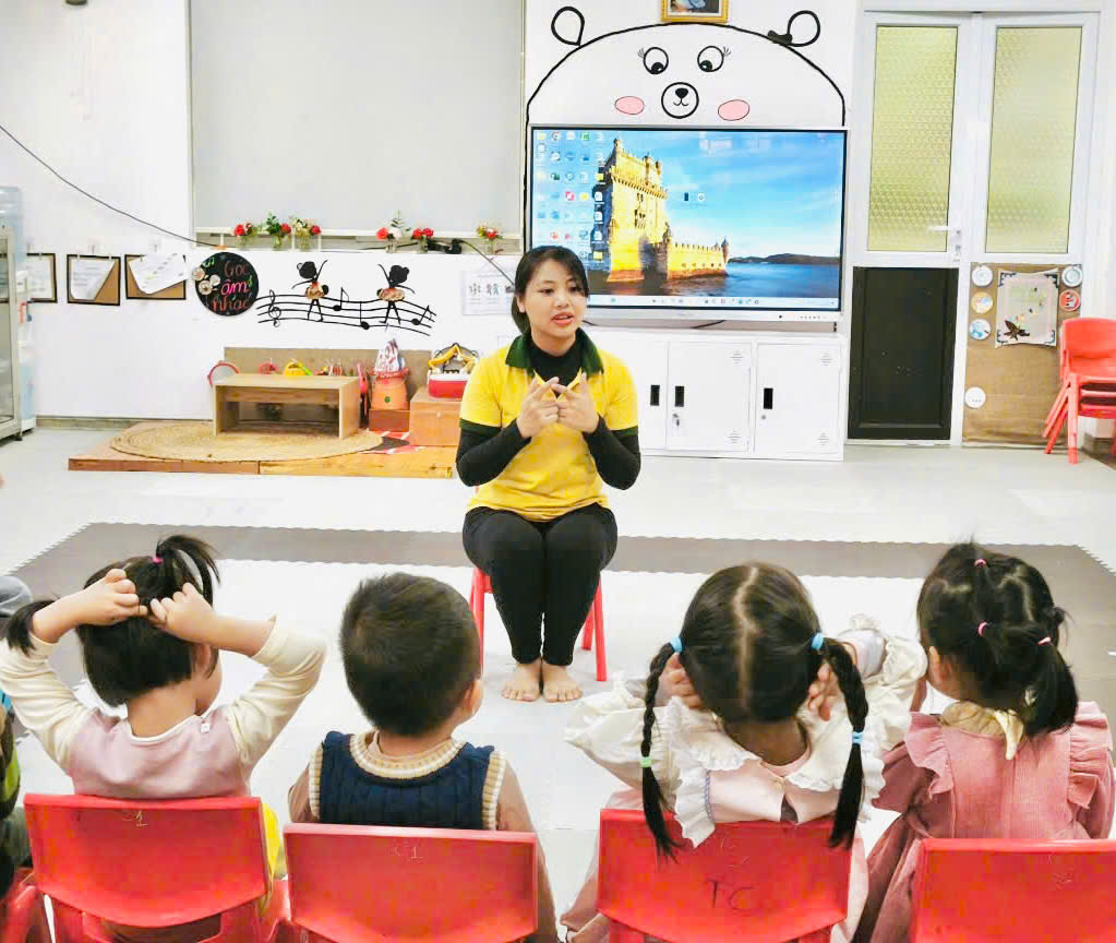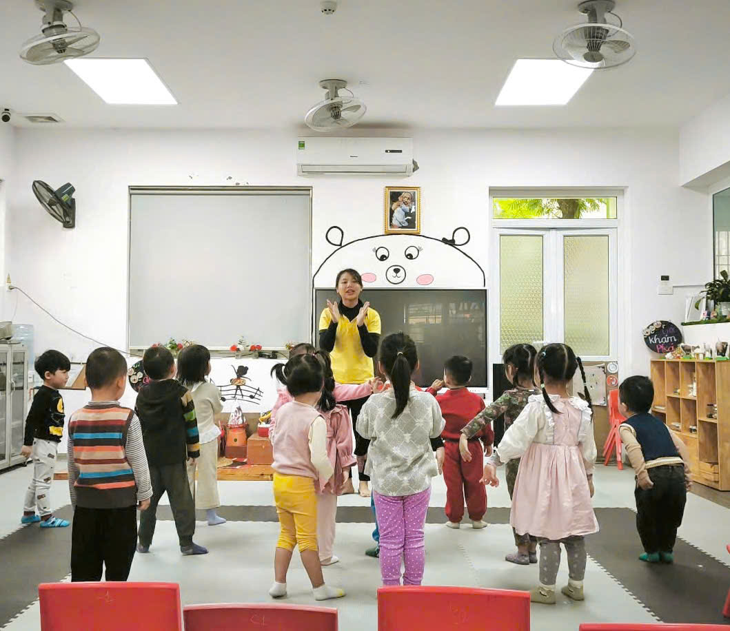 Những bước nhảy ngây ngô, những cánh tay nhỏ giơ cao cùng tiếng cười giòn tan của các bé làm không khí lớp học tràn đầy sức sống. Qua từng động tác, các bé không chỉ rèn luyện sự khéo léo mà còn học cách phối hợp nhịp nhàng, cảm nhận tiết tấu âm nhạc và ghi nhớ những con số đầu tiên.