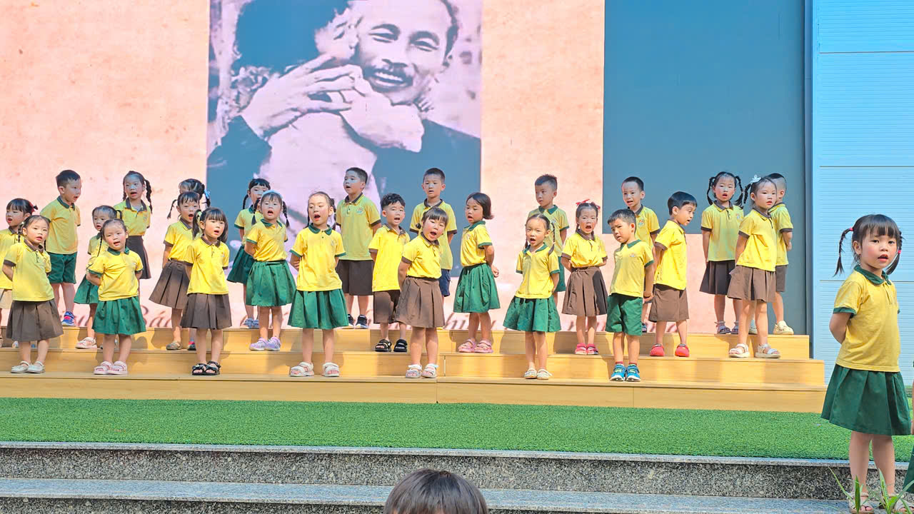 Ngay từ sáng sớm, các bé lớp A4 đã háo hức khoác lên mình những bộ trang phục cờ đỏ sao vàng rực rỡ, gương mặt ánh lên niềm vui. Trong buổi lễ kỉ niệm, học sinh lớp A4 vinh dự được hòa giọng trong tiết mục đồng ca “Ai yêu Bác Hồ Chí Minh hơn thiếu niên nhi đồng”. Giọng ca trong trẻo, hồn nhiên cùng những ánh mắt lấp lánh của các con đã mang đến cho chương trình một không khí trang nghiêm mà cũng thật ấm áp, khiến nhiều phụ huynh và cô giáo xúc động.