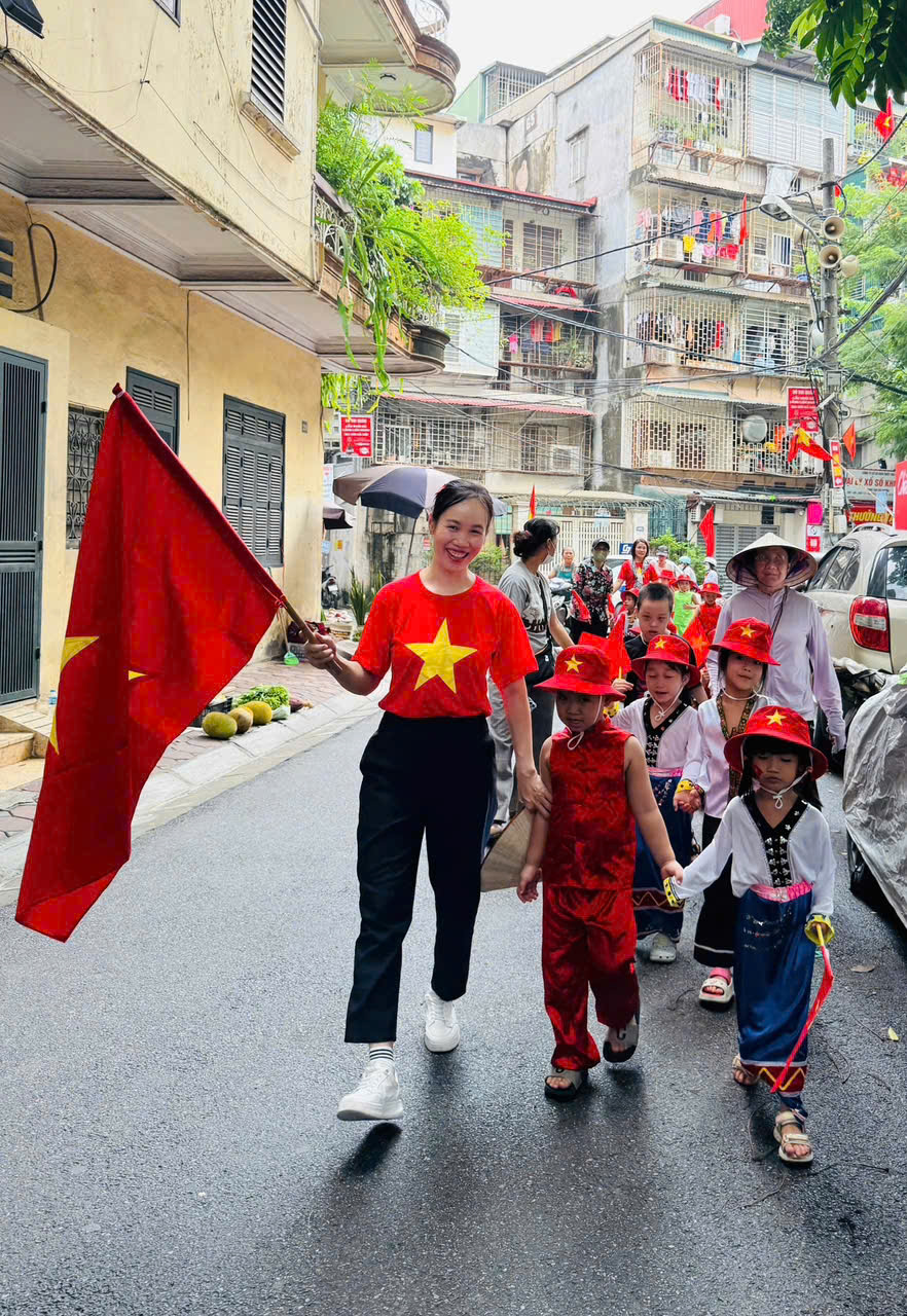 Không chỉ dừng lại ở sân khấu, các con lớp A4 còn được hòa mình vào hoạt động diễu hành cùng toàn trường. Trong sắc đỏ rực rỡ của lá cờ Tổ quốc, từng bước chân nhỏ bé nhưng đầy tự hào của các bé MGL A4 như gửi gắm thông điệp: “Chúng con tự hào là người Việt Nam!”. Niềm hân hoan hiện rõ trên từng nụ cười, từng cánh tay vẫy cờ, để lại trong lòng cô trò những kỉ niệm thật đẹp.