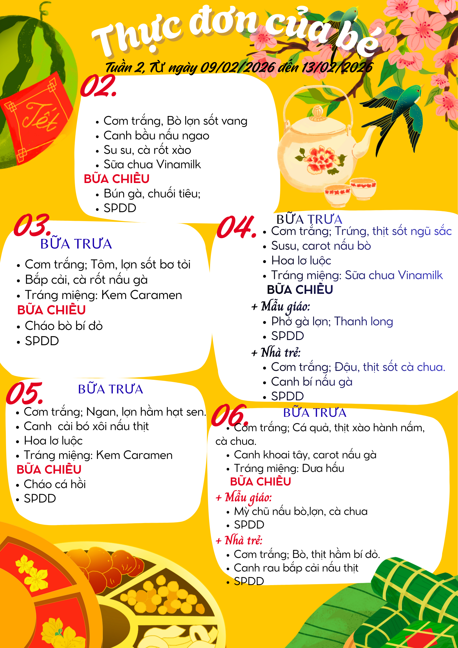 Thực đơn tuần 2 (từ ngày 09/02 đến 13/02/2026) của các bé trường Mầm non Họa Mi